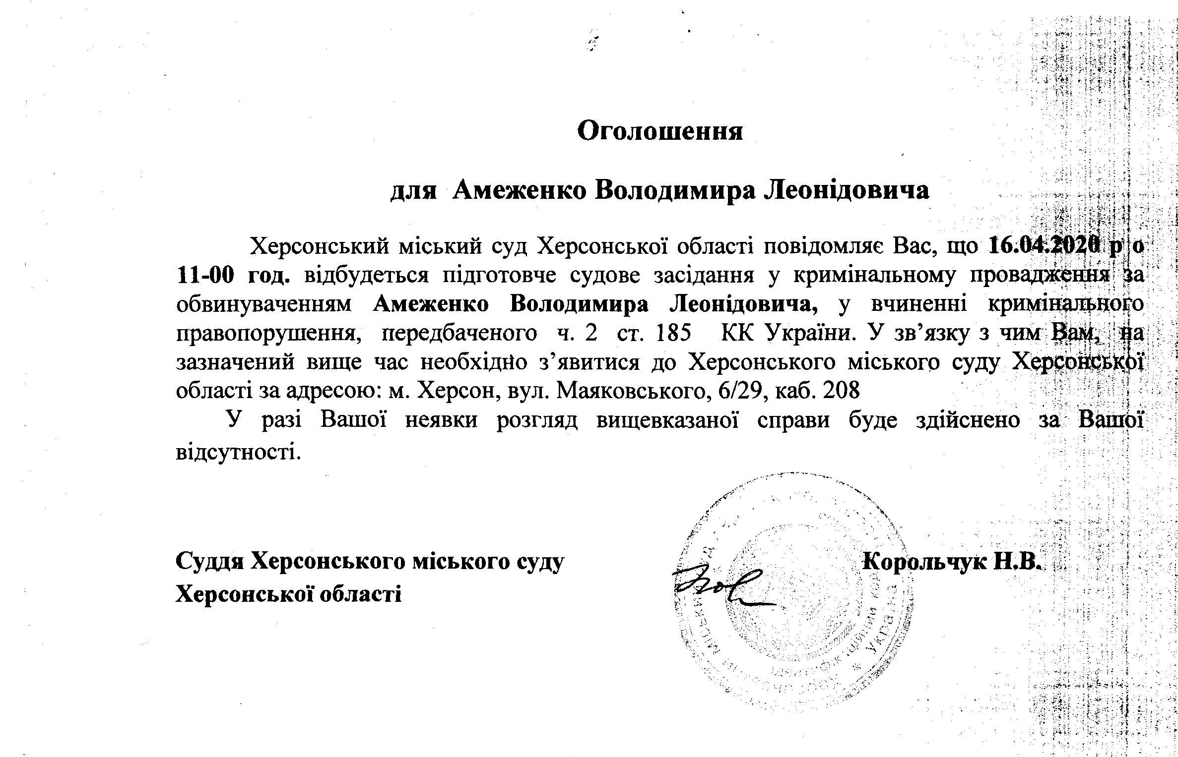 ОГОЛОШЕННЯ для Амеженко Володимира Леонідовича