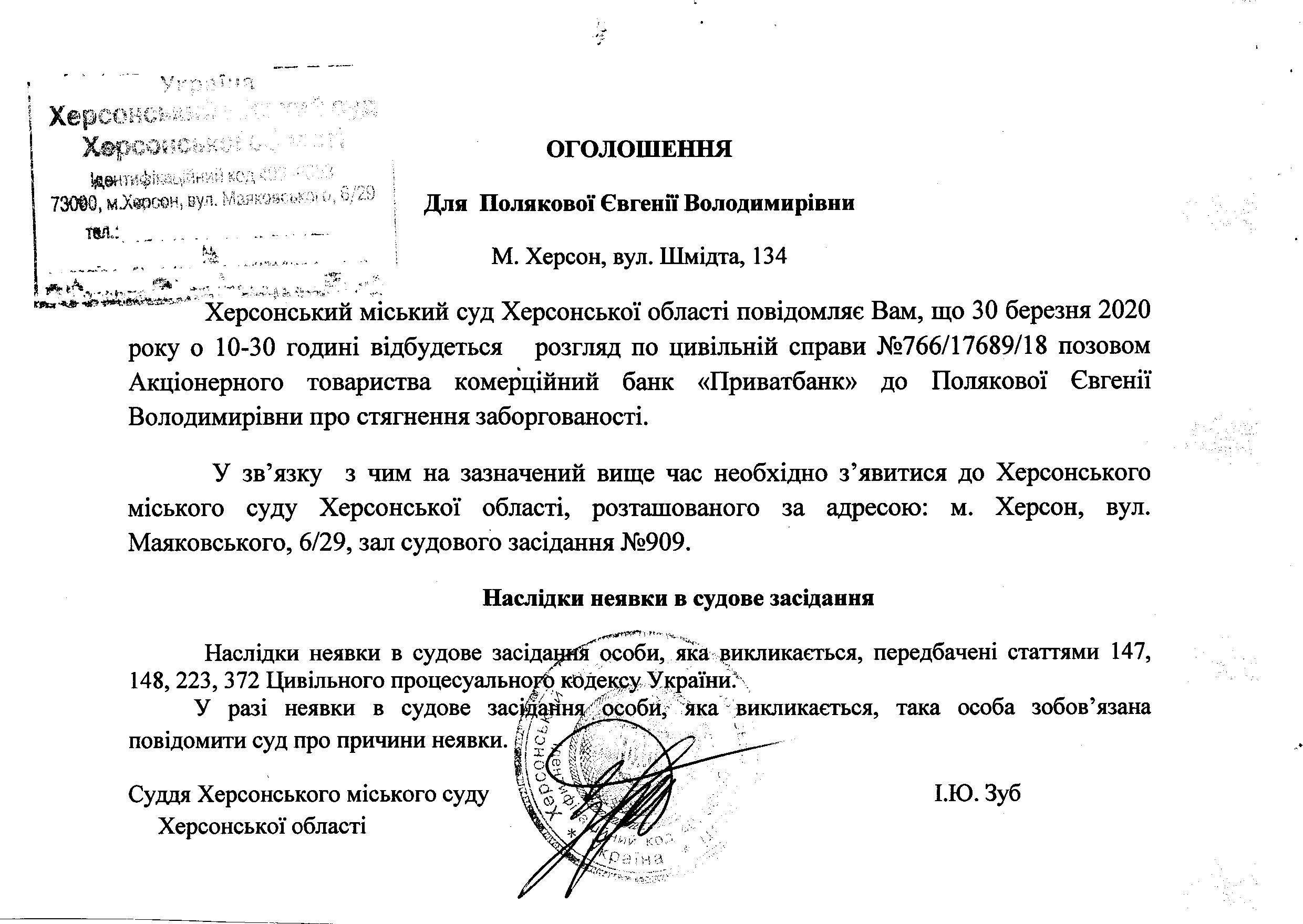 ОГОЛОШЕННЯ для Полякової Євгенії Володимирівни