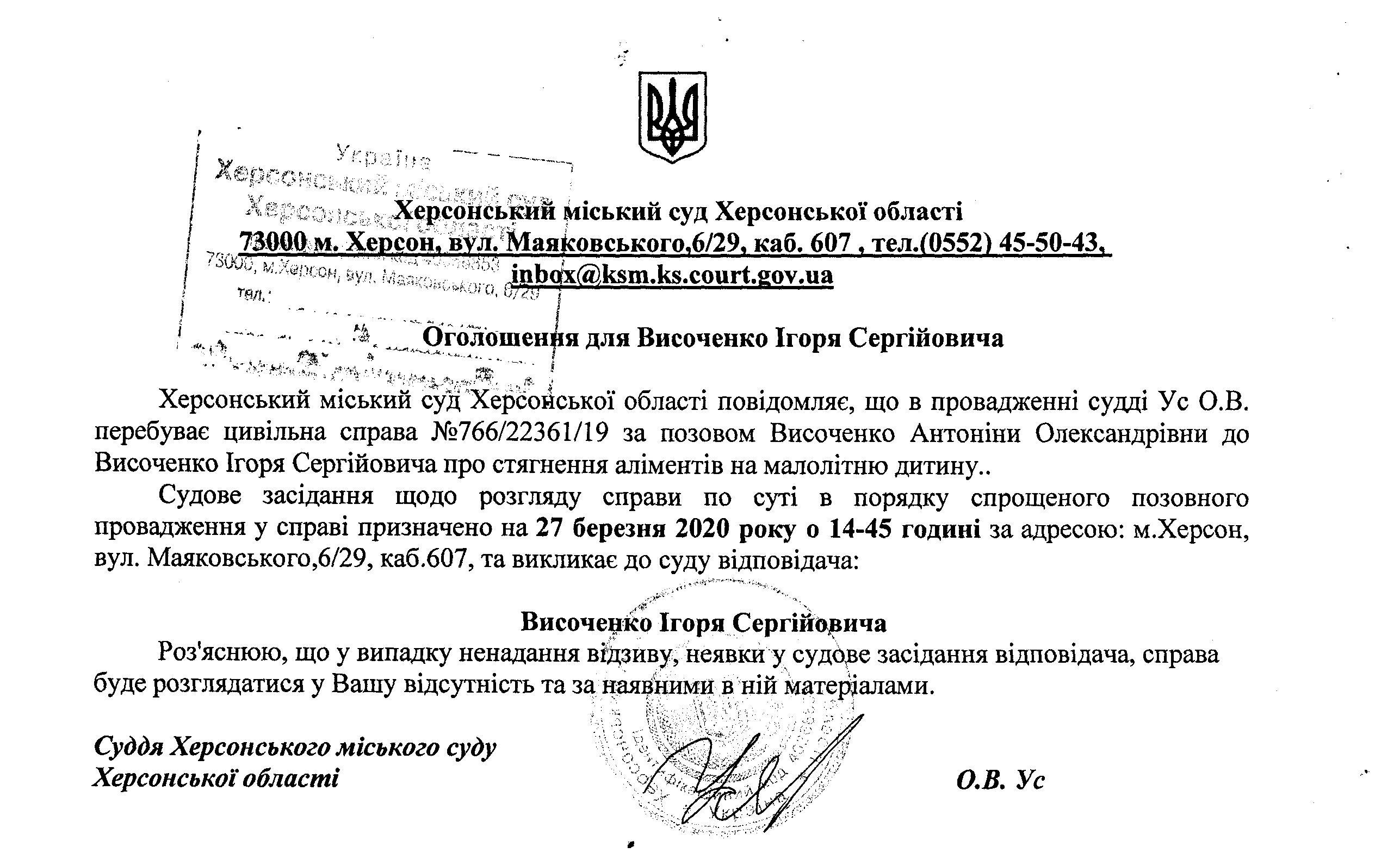 ОГОЛОШЕННЯ для Височенка Ігоря Сергійовича