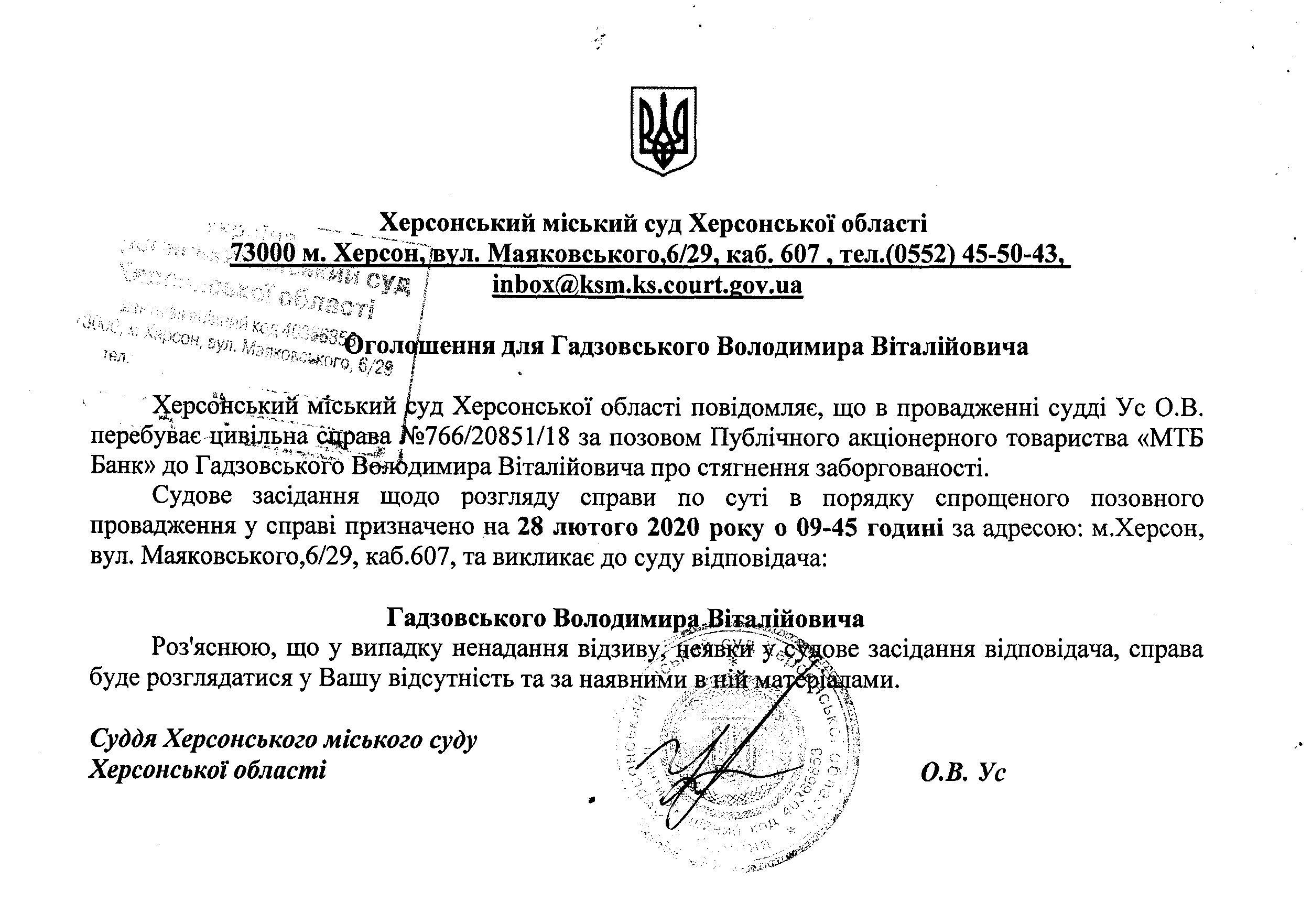 ОГОЛОШЕННЯ для Гадзовського Володимира Віталійовича