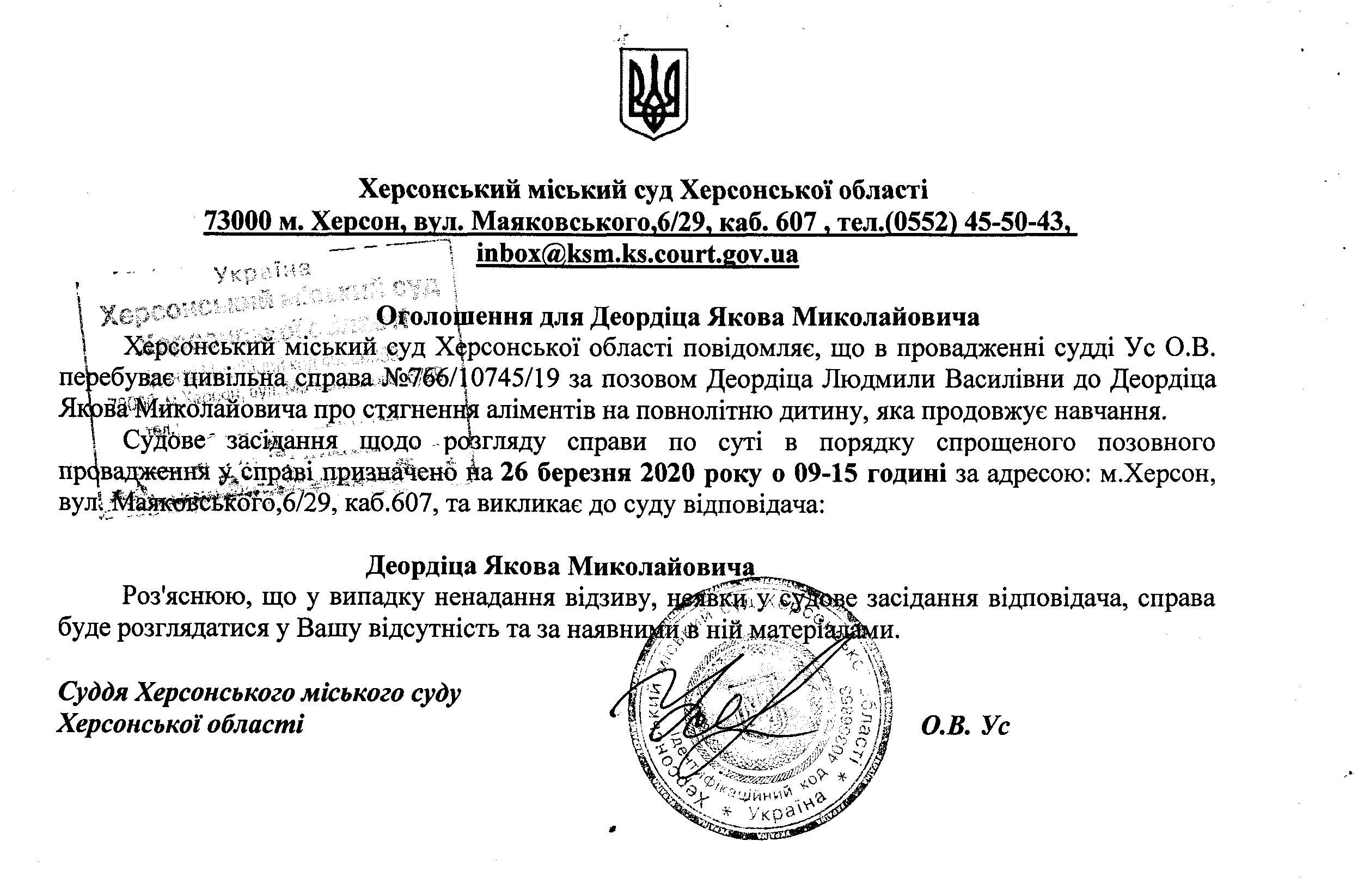 ОГОЛОШЕННЯ для Деордіци Якова Миколайовича