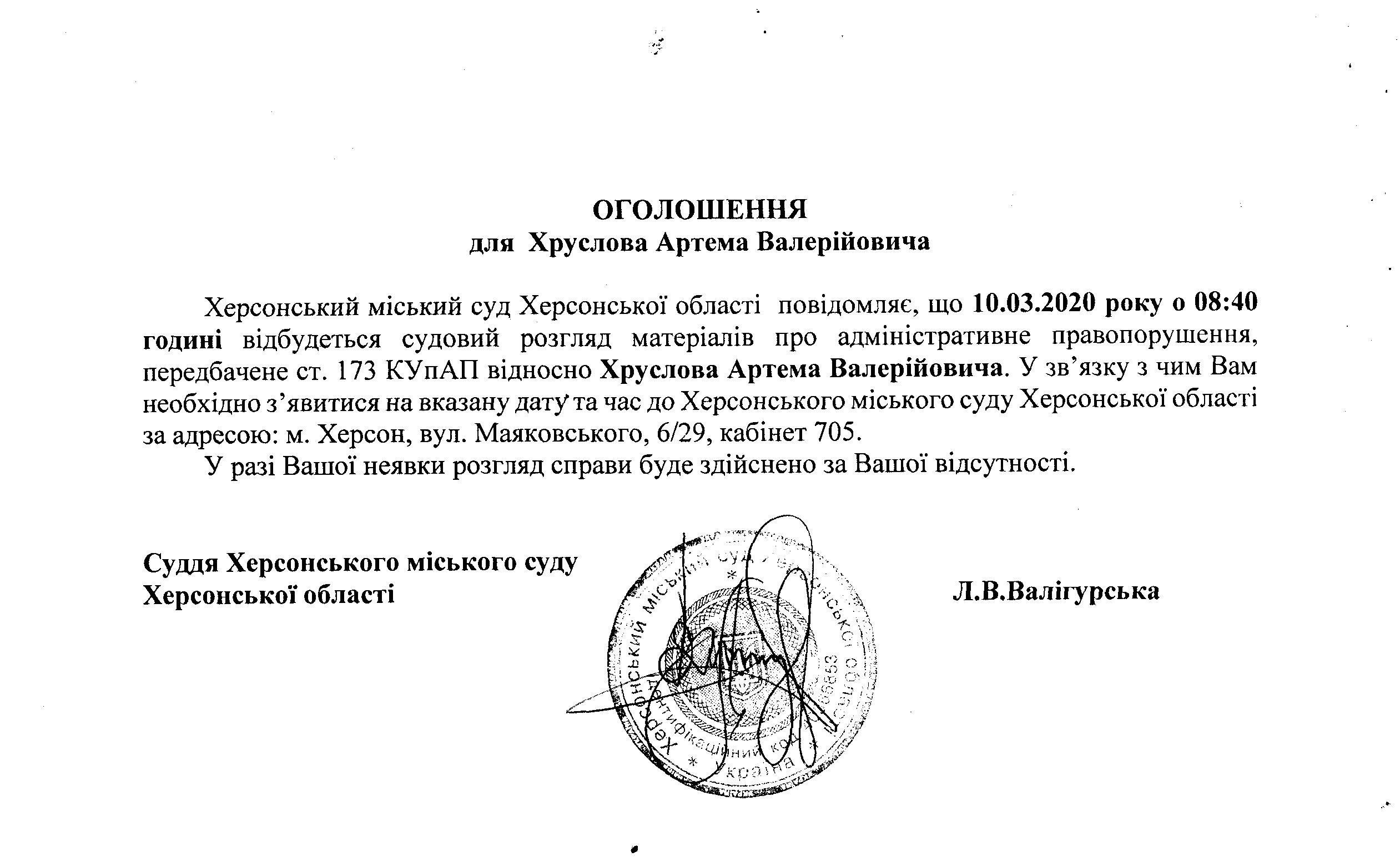 ОГОЛОШЕННЯ для Хруслова Артема Валерійовича