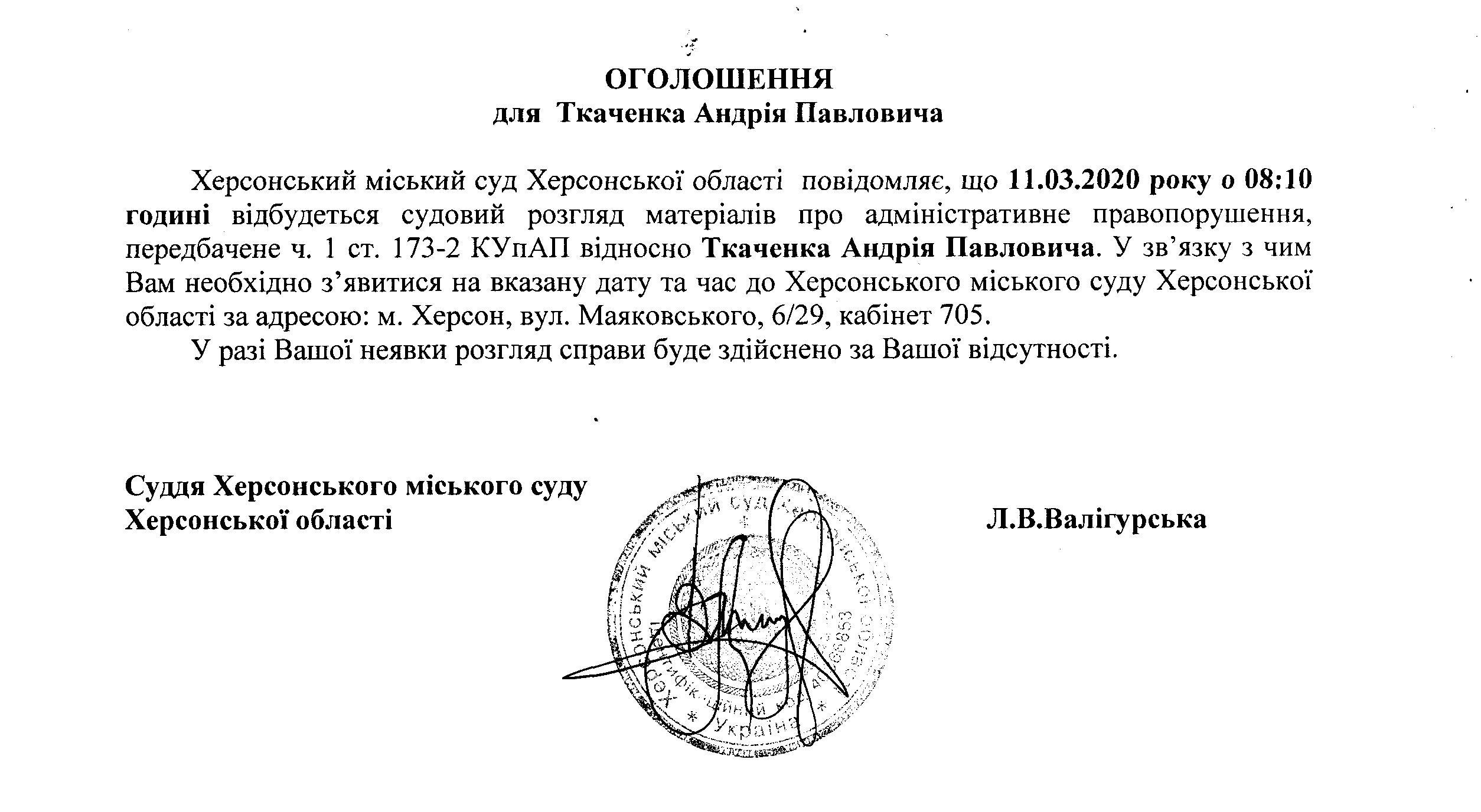 ОГОЛОШЕННЯ для Ткаченка Андрія Павловича