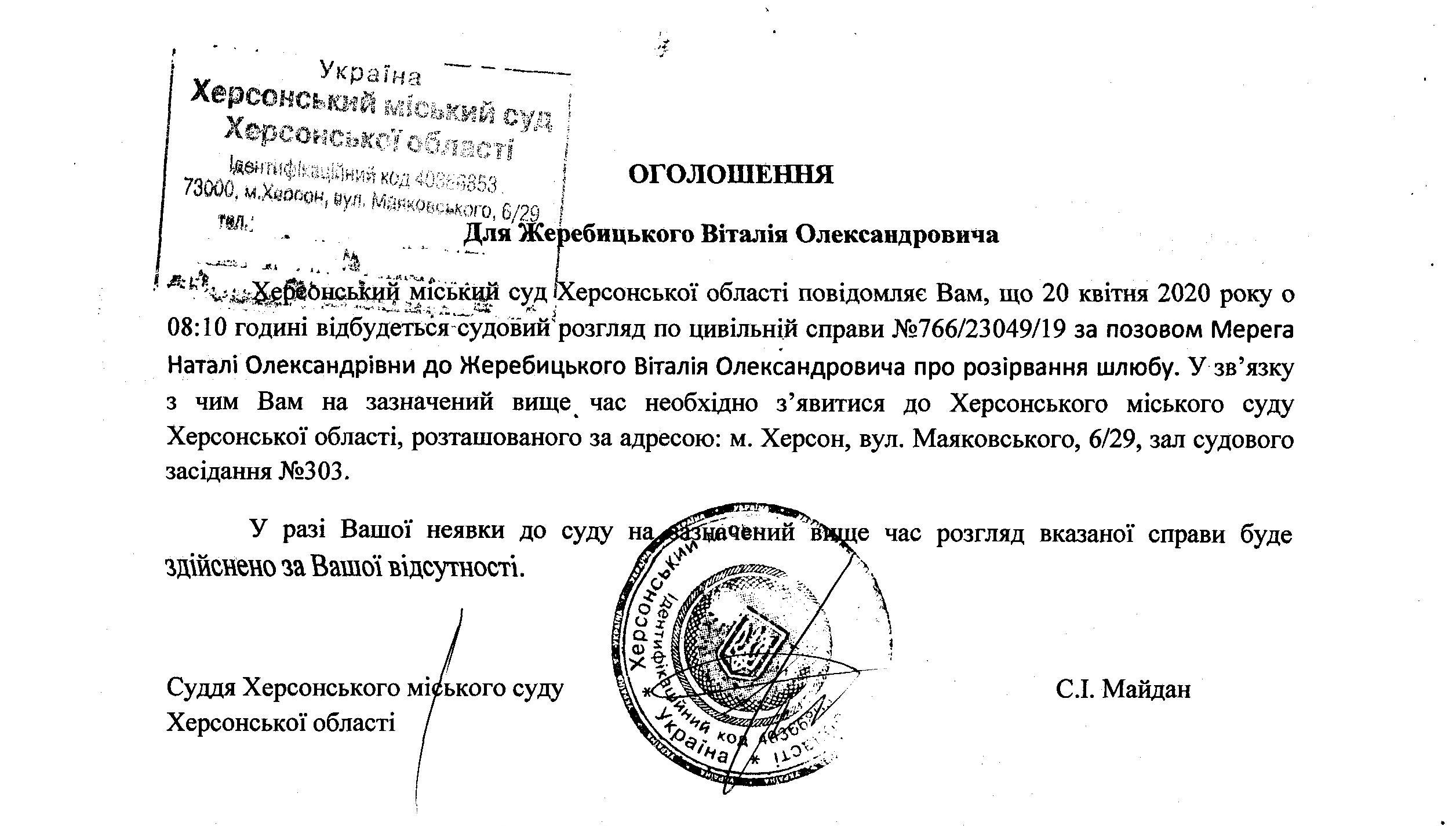 ОГОЛОШЕННЯ для Жеребицького Віталія Олександровича