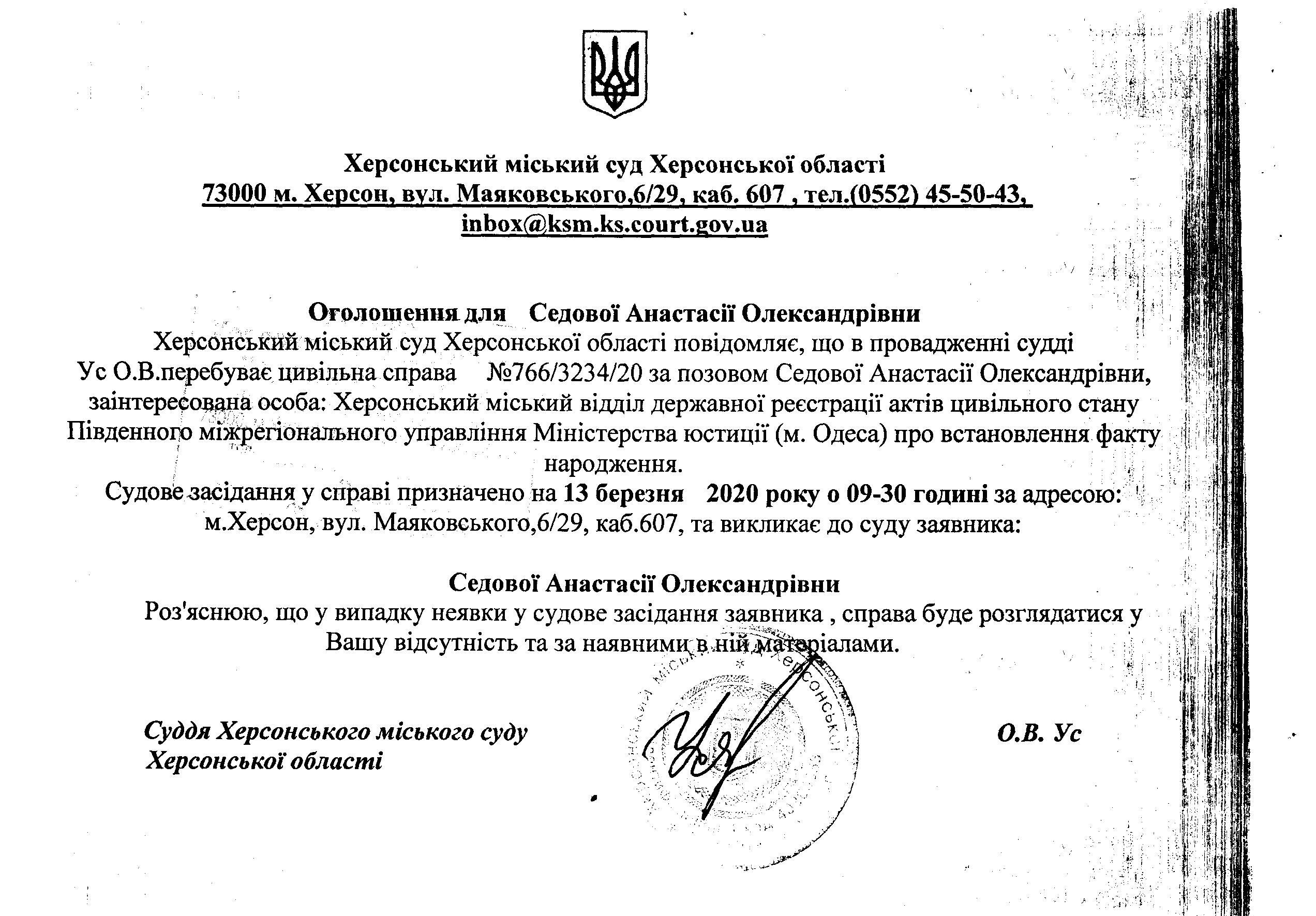 ОГОЛОШЕННЯ для Седової Анастасії Олександрівни