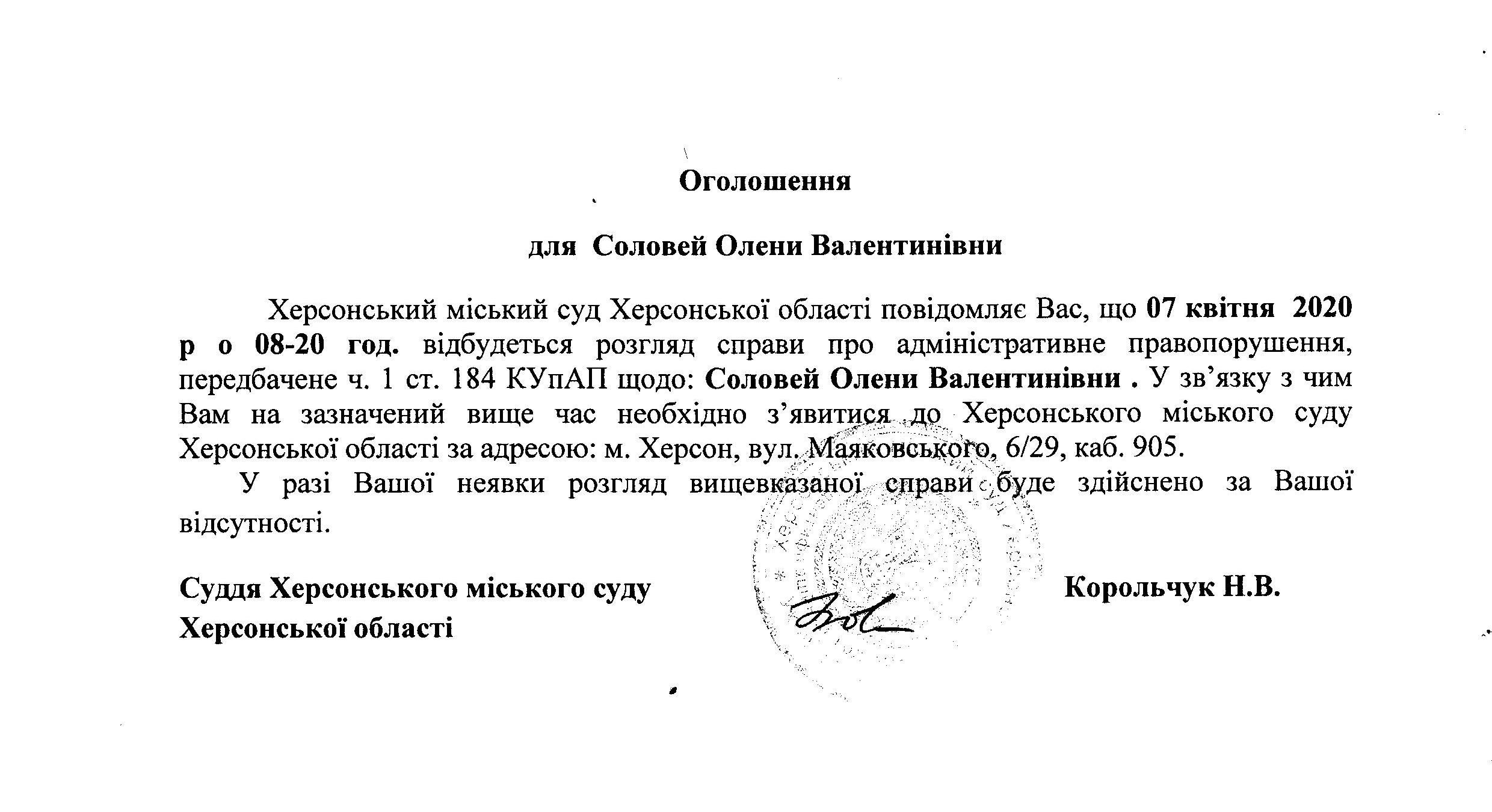 ОГОЛОШЕННЯ для Соловей Олени Валентинівни