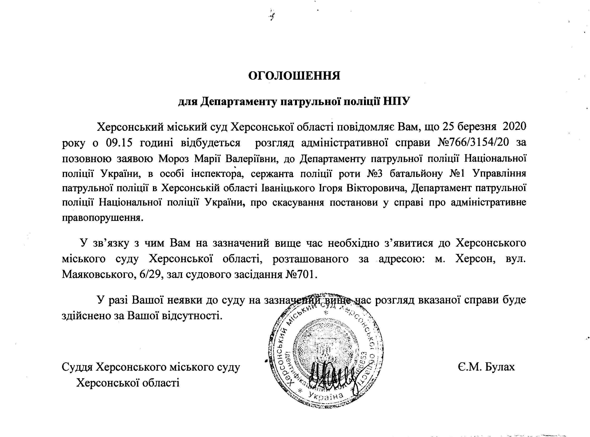 ОГОЛОШЕННЯ ПРО ВИКЛИК ДО СУДУ
