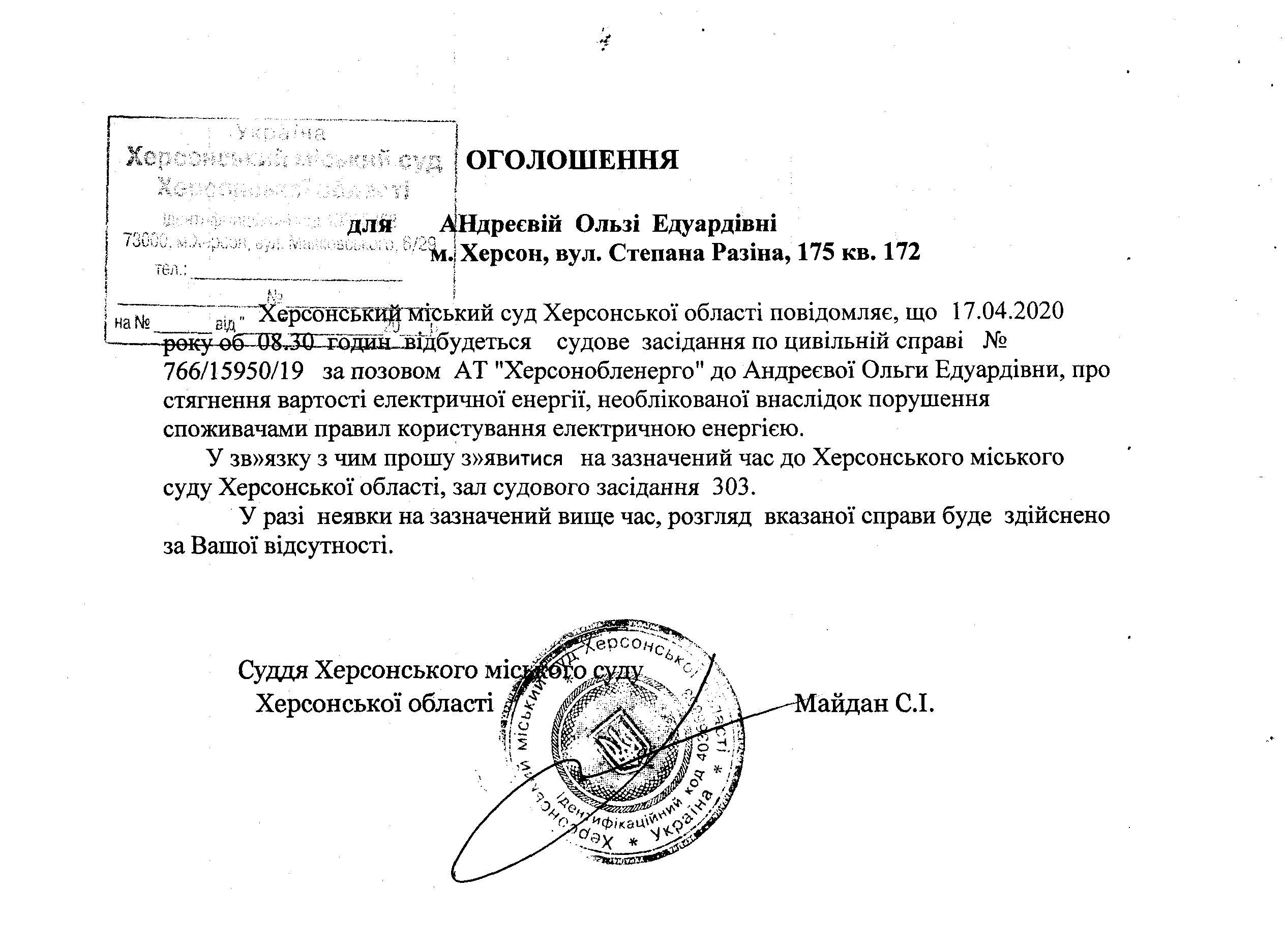 ОГОЛОШЕННЯ ПРО ВИКЛИК ДО СУДУ