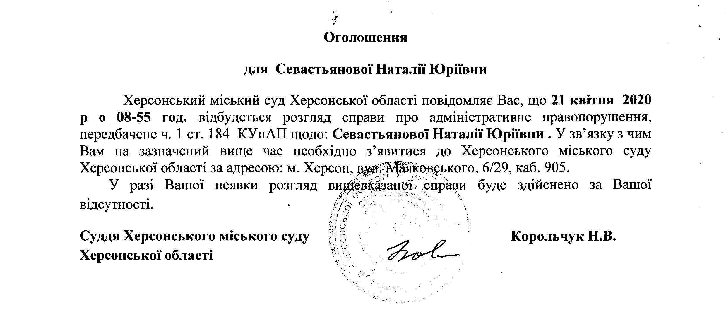 ОГОЛОШЕННЯ для Севастьянової Наталії Юріївни