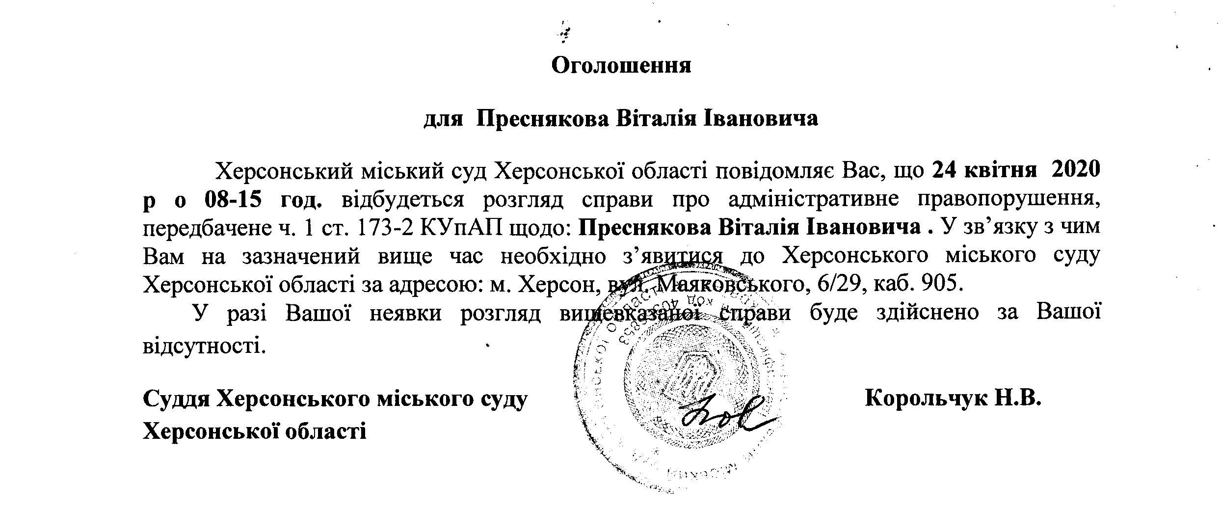ОГОЛОШЕННЯ для Преснякова Віталія Івановича