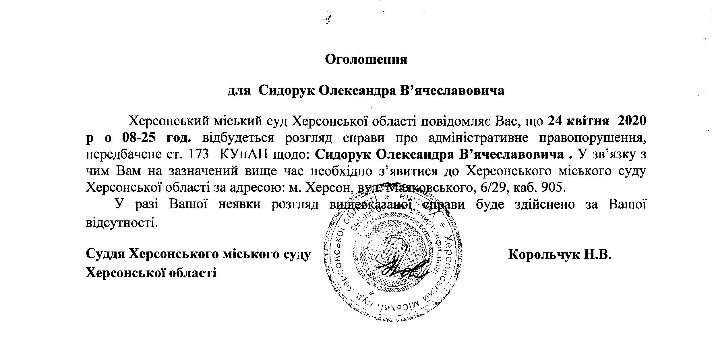 ОГОЛОШЕННЯ для Сидорука Олександра В`ячеславовича