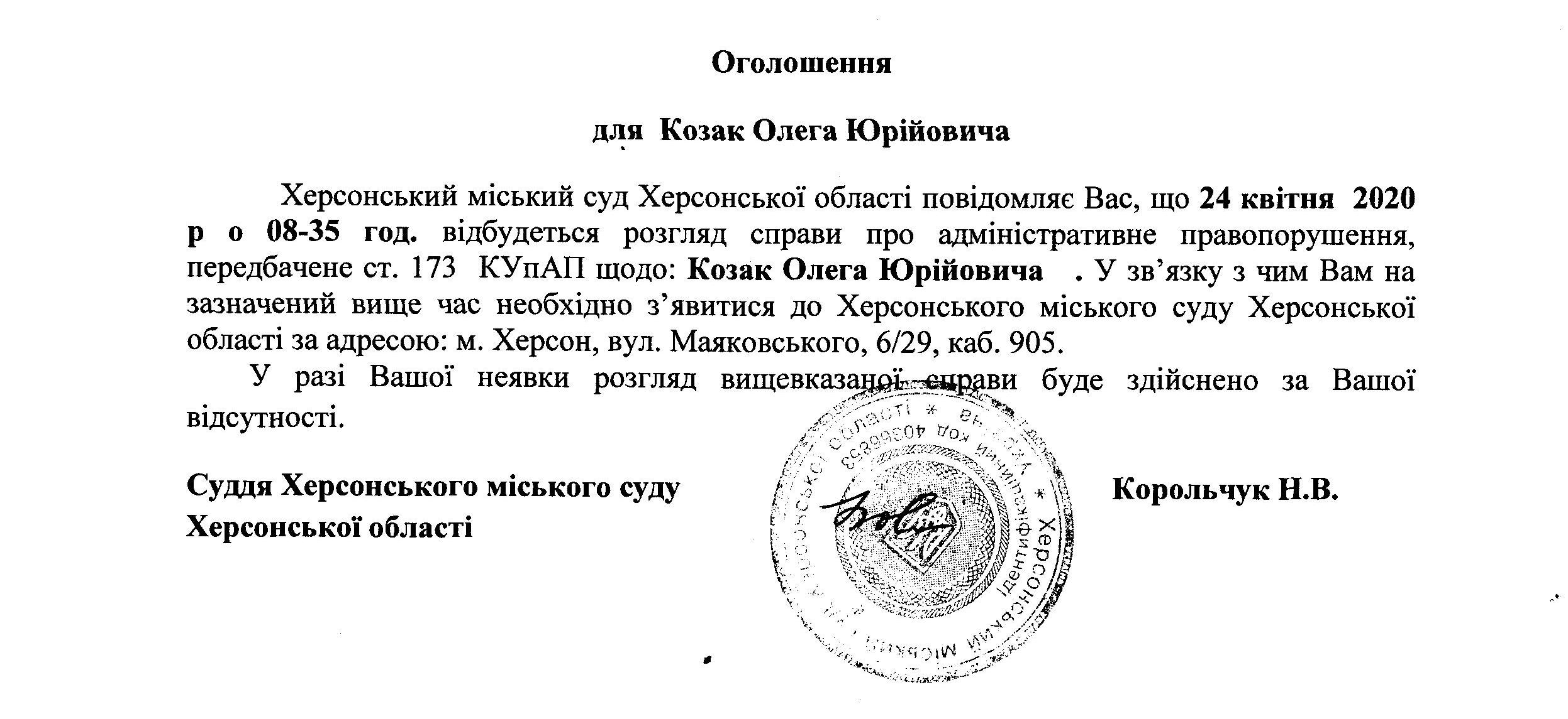 ОГОЛОШЕННЯ ПРО ВИКЛИК ДО СУДУ