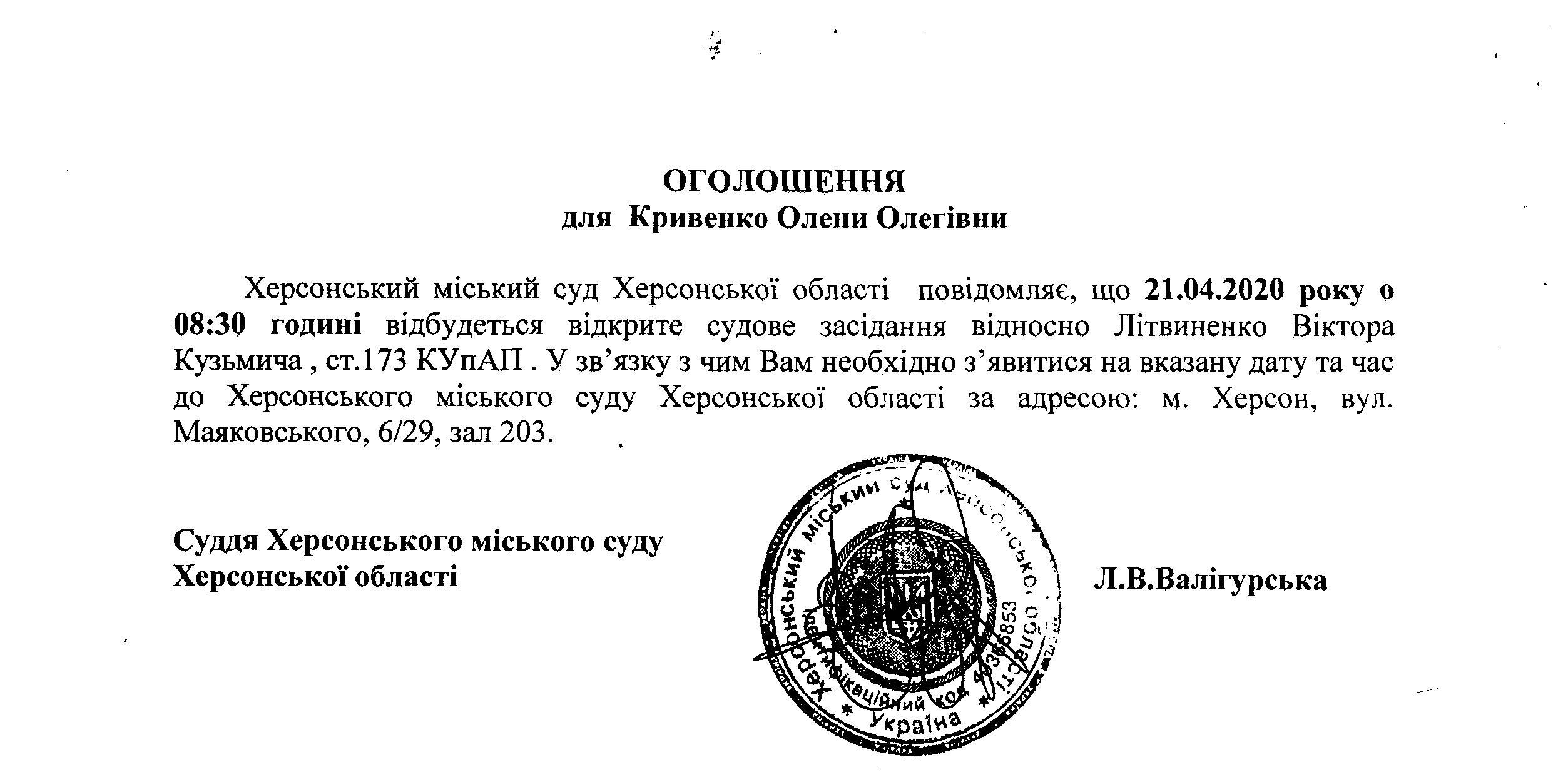 ОГОЛОШЕННЯ для Кривенко Олени Олегівни