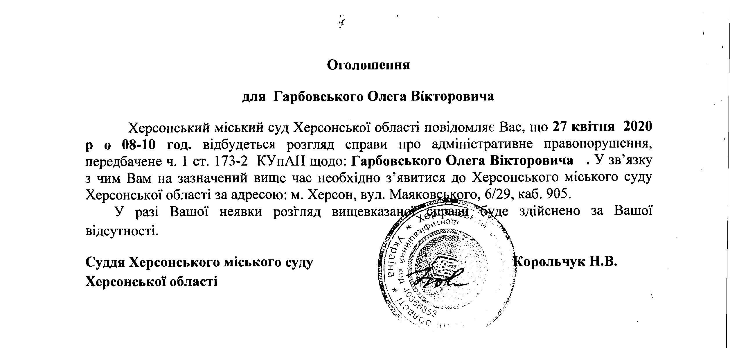 ОГОЛОШЕННЯ для Гарбовського Олега Вікторовича
