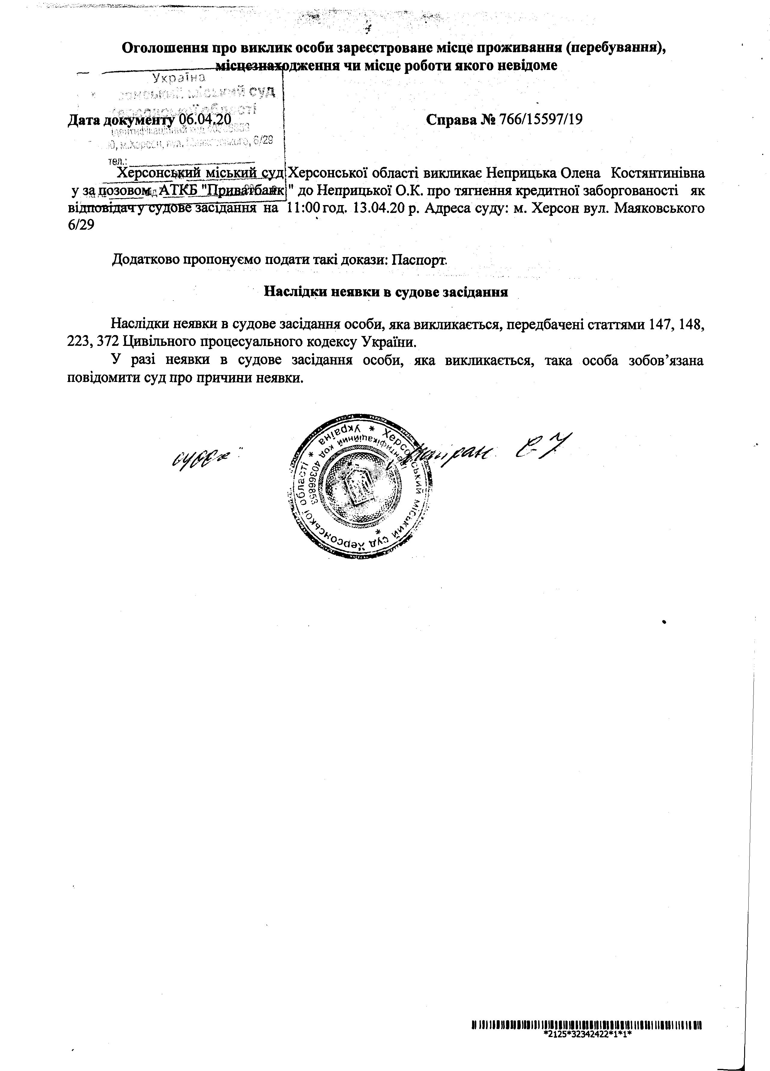 ОГОЛОШЕННЯ для Неприцької Олени Костянтинівни