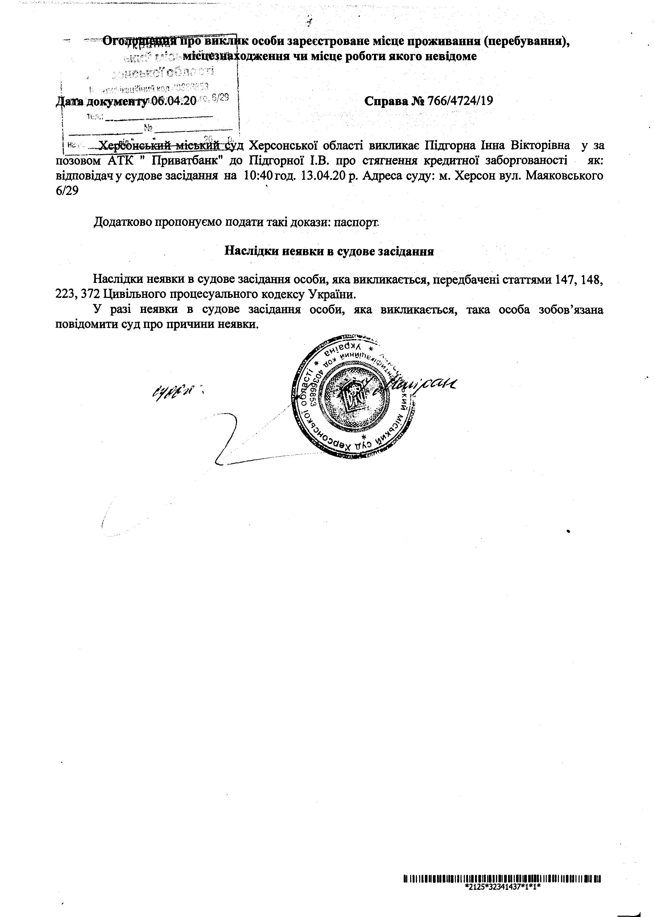ОГОЛОШЕННЯ для Підгорної Інни Вікторівни