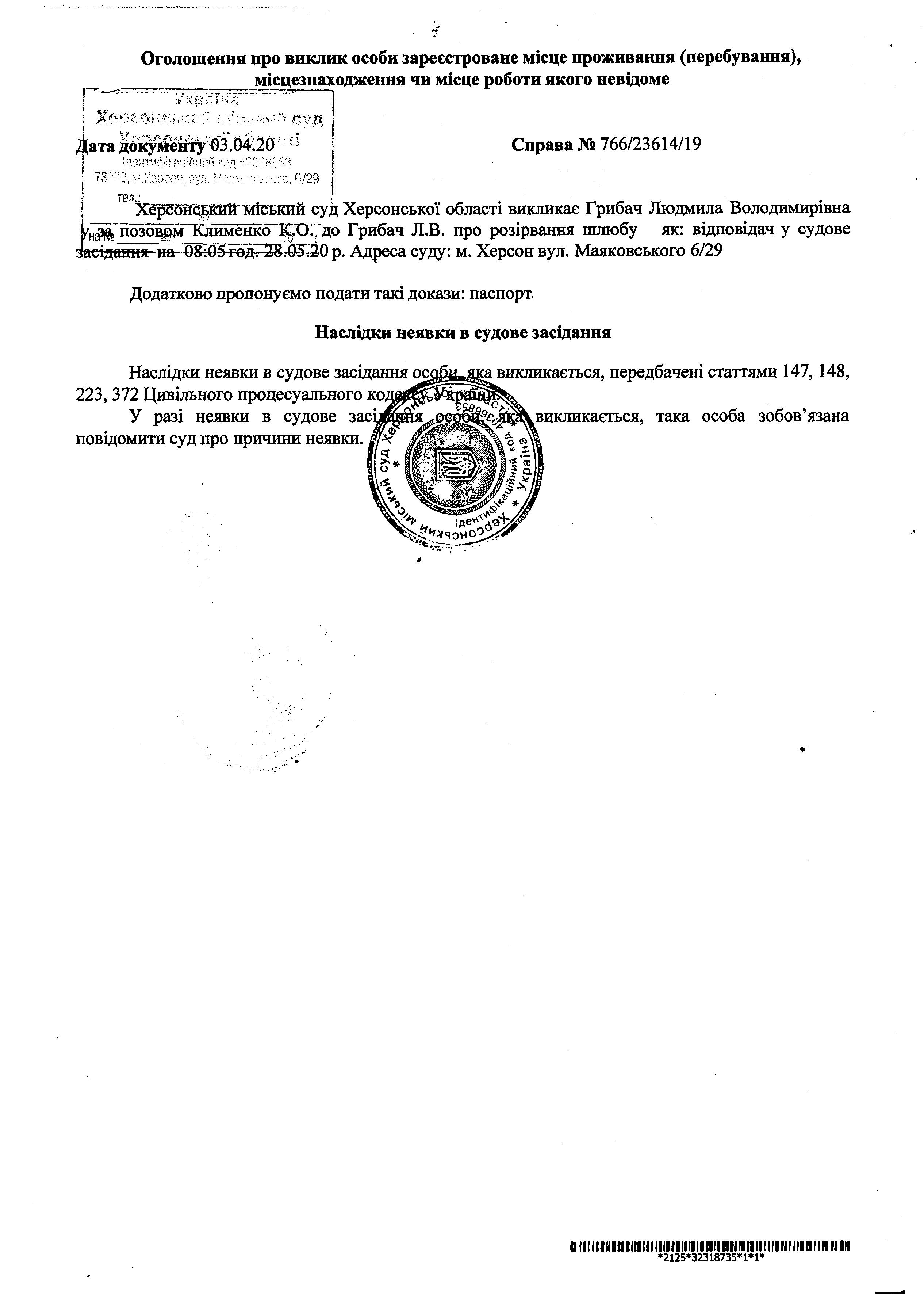 ОГОЛОШЕННЯ для Грибач Людмили Володимирівни