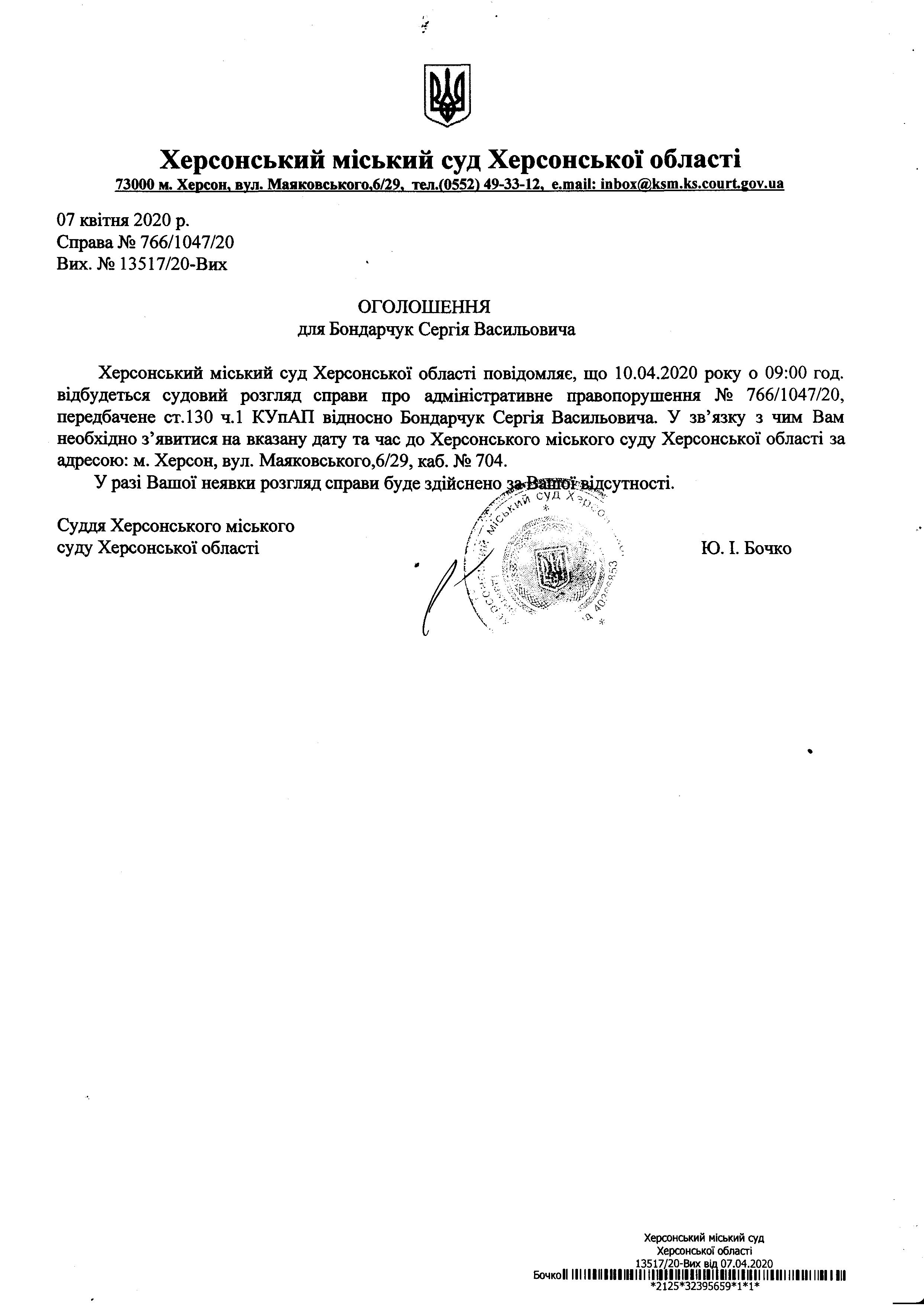 ОГОЛОШЕННЯ для Бондарчук Сергія Васильовича