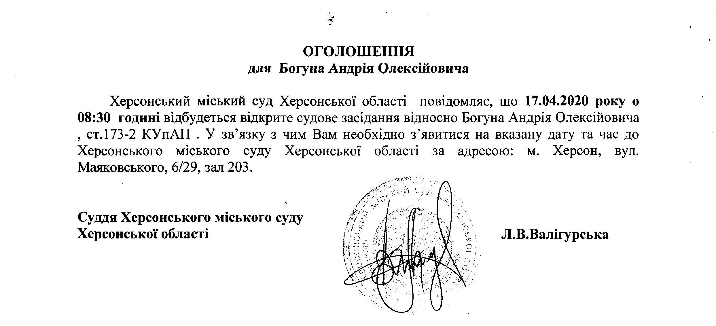 ОГОЛОШЕННЯ для Богуна Андрія Олексійовича