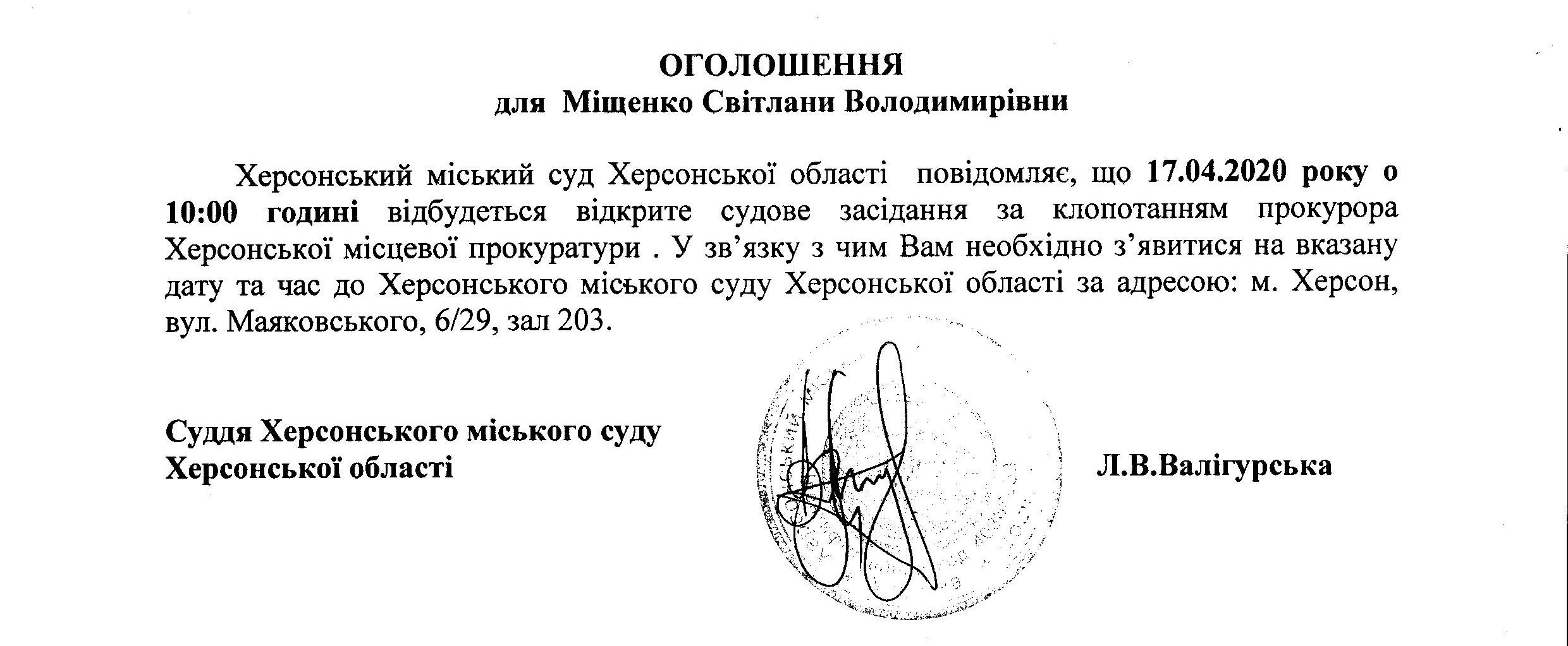ОГОЛОШЕННЯ для Міщенко Світлани Володимирівни
