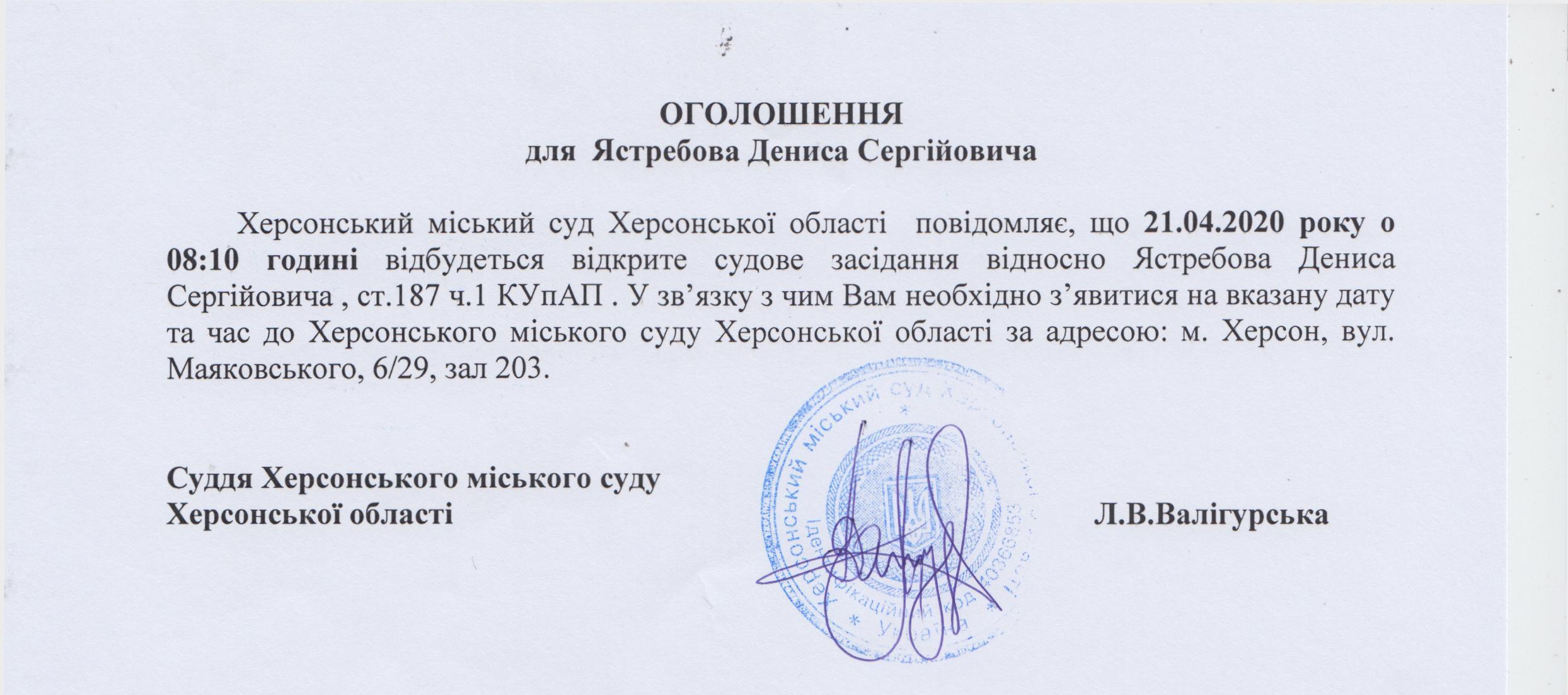 ОГОЛОШЕННЯ для Ястребова Дениса Сергійовича
