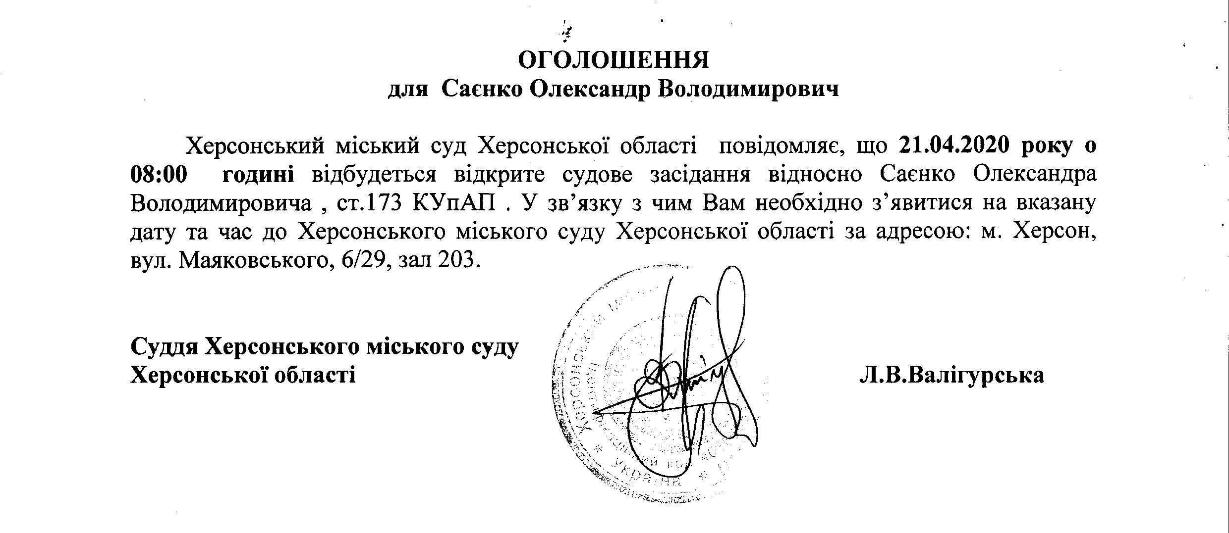 ОГОЛОШЕННЯ для Саєнко Олександра Володимировича