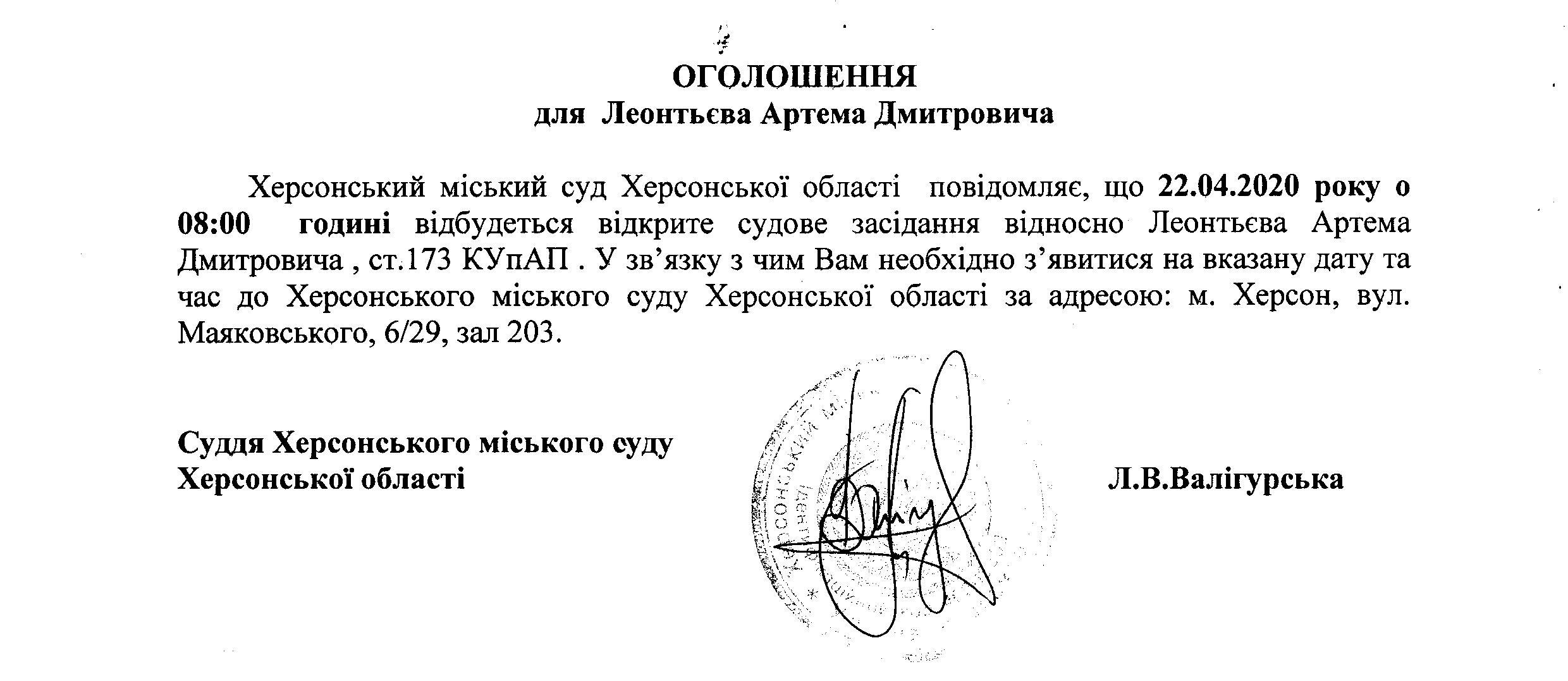 ОГОЛОШЕННЯ для Леонтьєва Артема Дмитровича