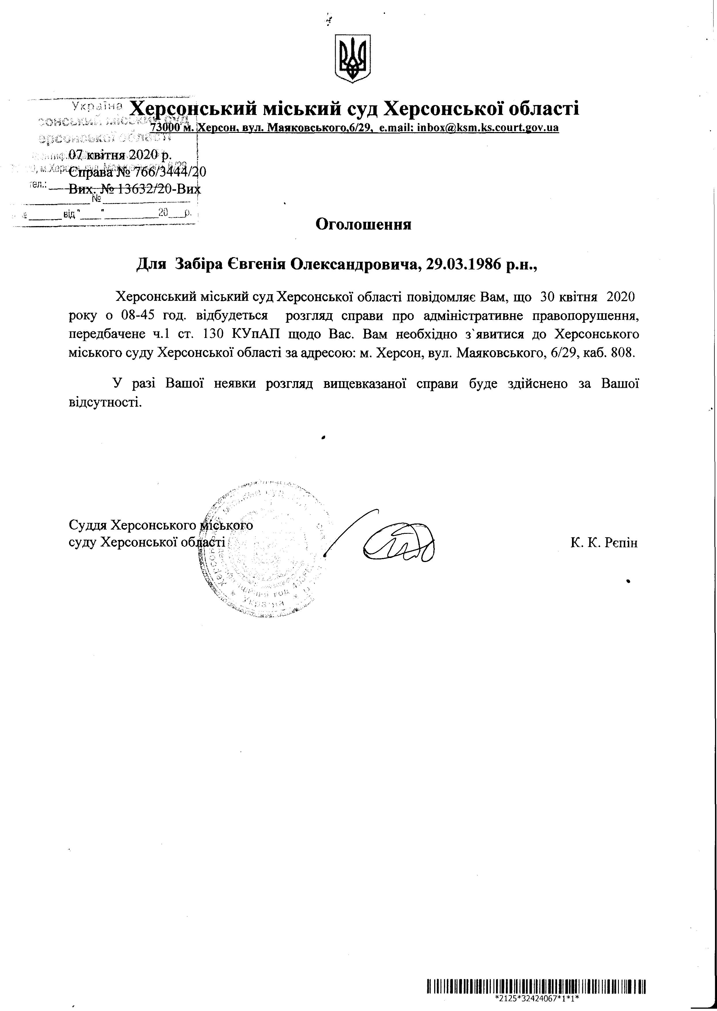 ОГОЛОШЕННЯ ПРО ВИКЛИК ДО СУДУ