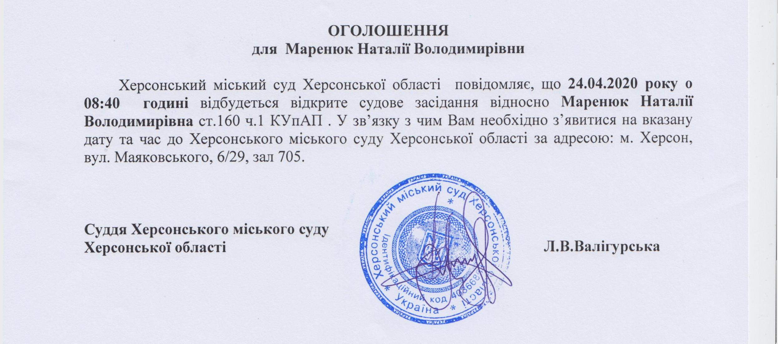 ОГОЛОШЕННЯ для Маренюк Наталії Володимирівни