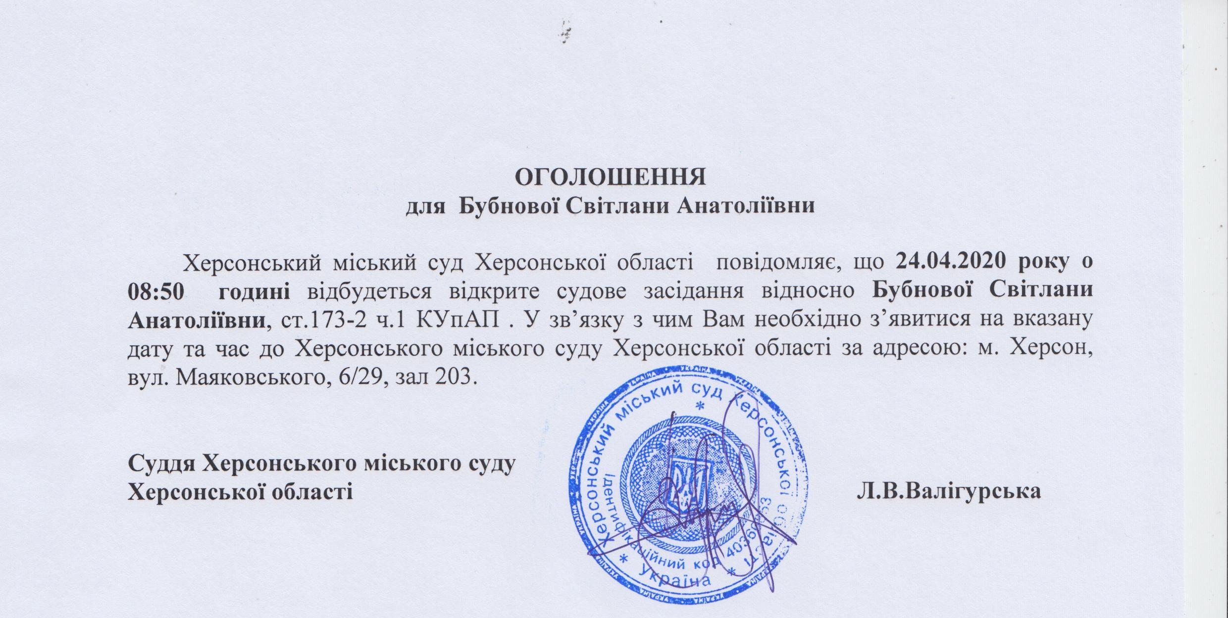 ОГОЛОШЕННЯ для Бубнової Світлани Анатоліївни