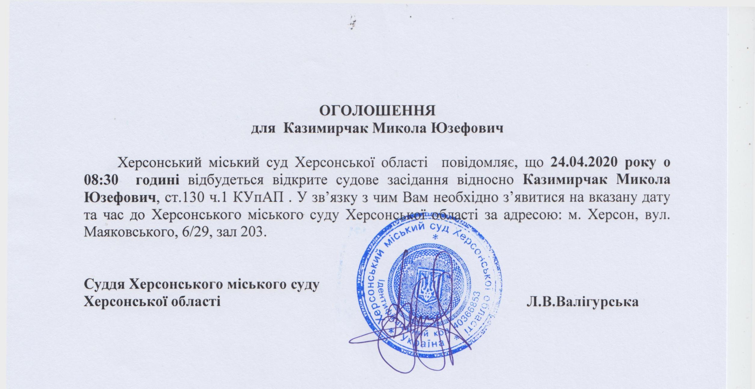 ОГОЛОШЕННЯ для Казимирчак Миколи Юзефовича