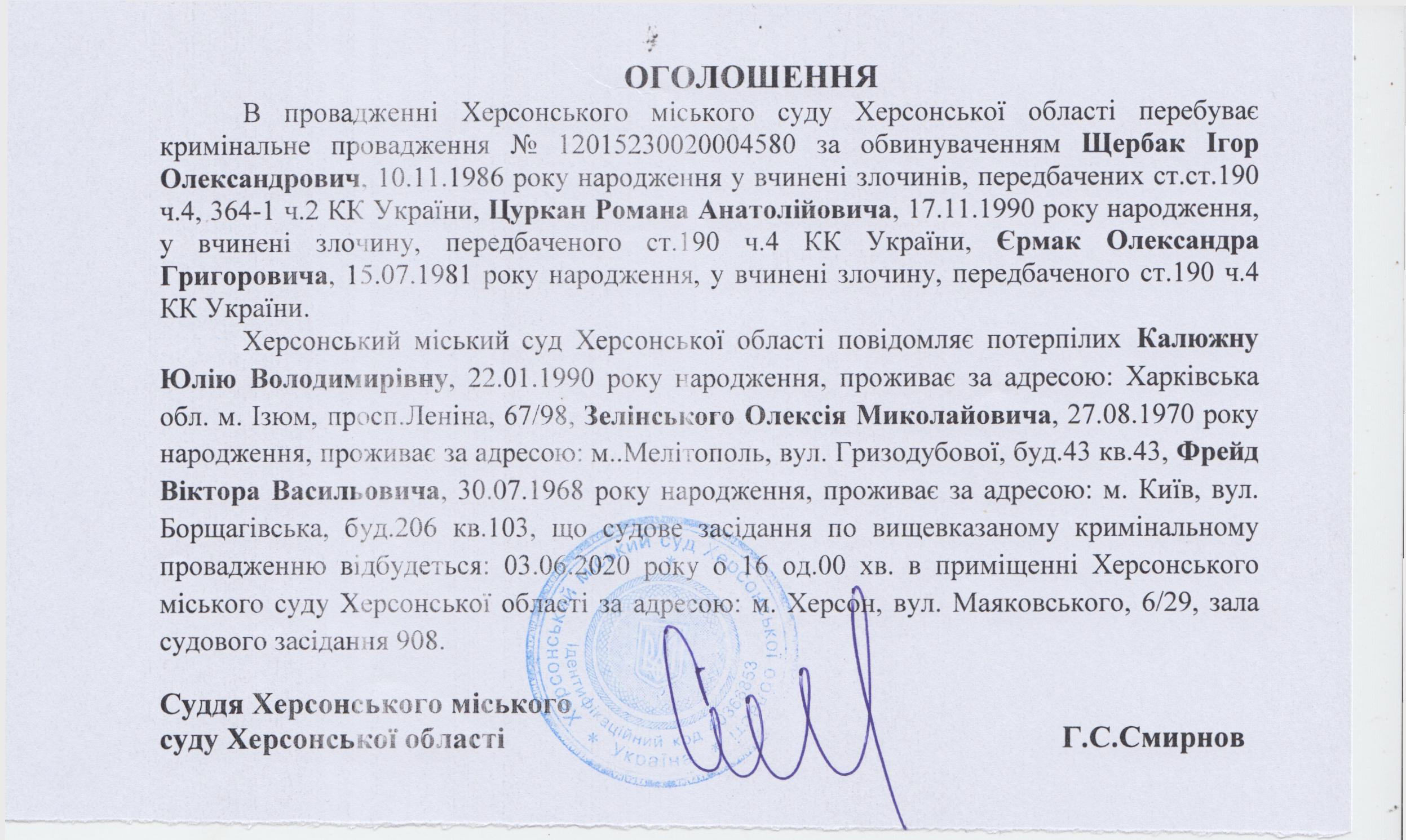 ОГОЛОШЕННЯ для Калюжної Юлії Володимирівни, Зелінського Олексія Миколайовича, Фрейд Віктора Васильовича, Нестеренко Віктора Олександровича