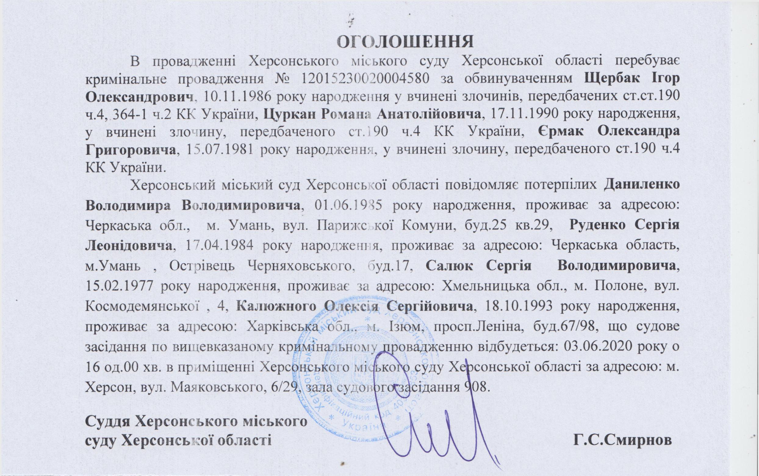 ОГОЛОШЕННЯ ПРО ВИКЛИК ДО СУДУ