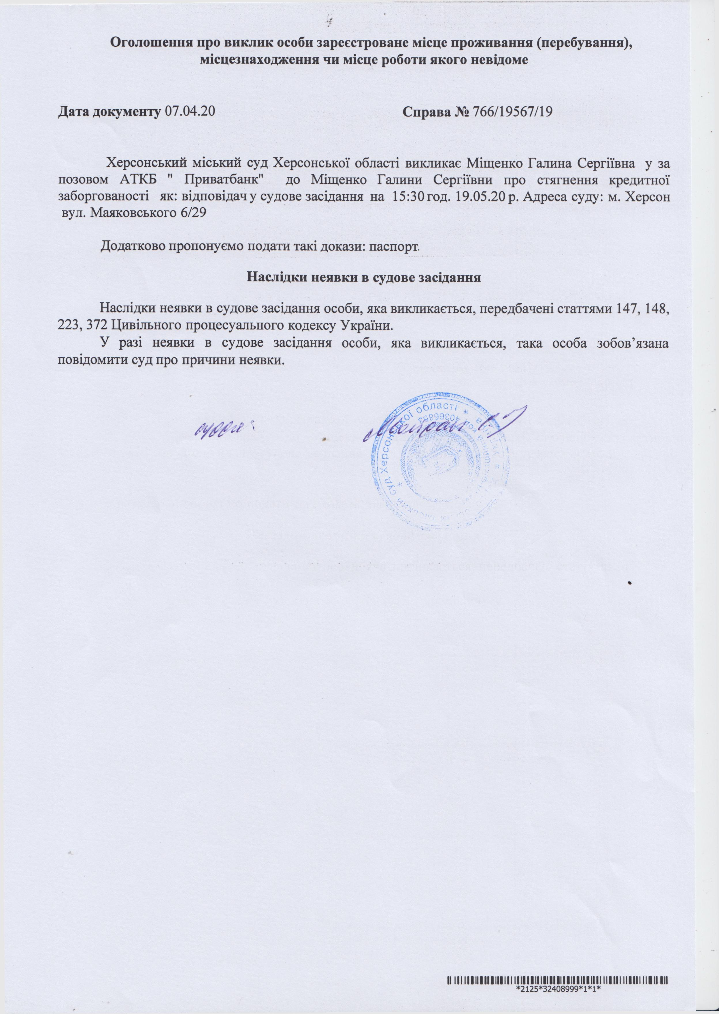 ОГОЛОШЕННЯ для Міщенко Галини Сергіївни