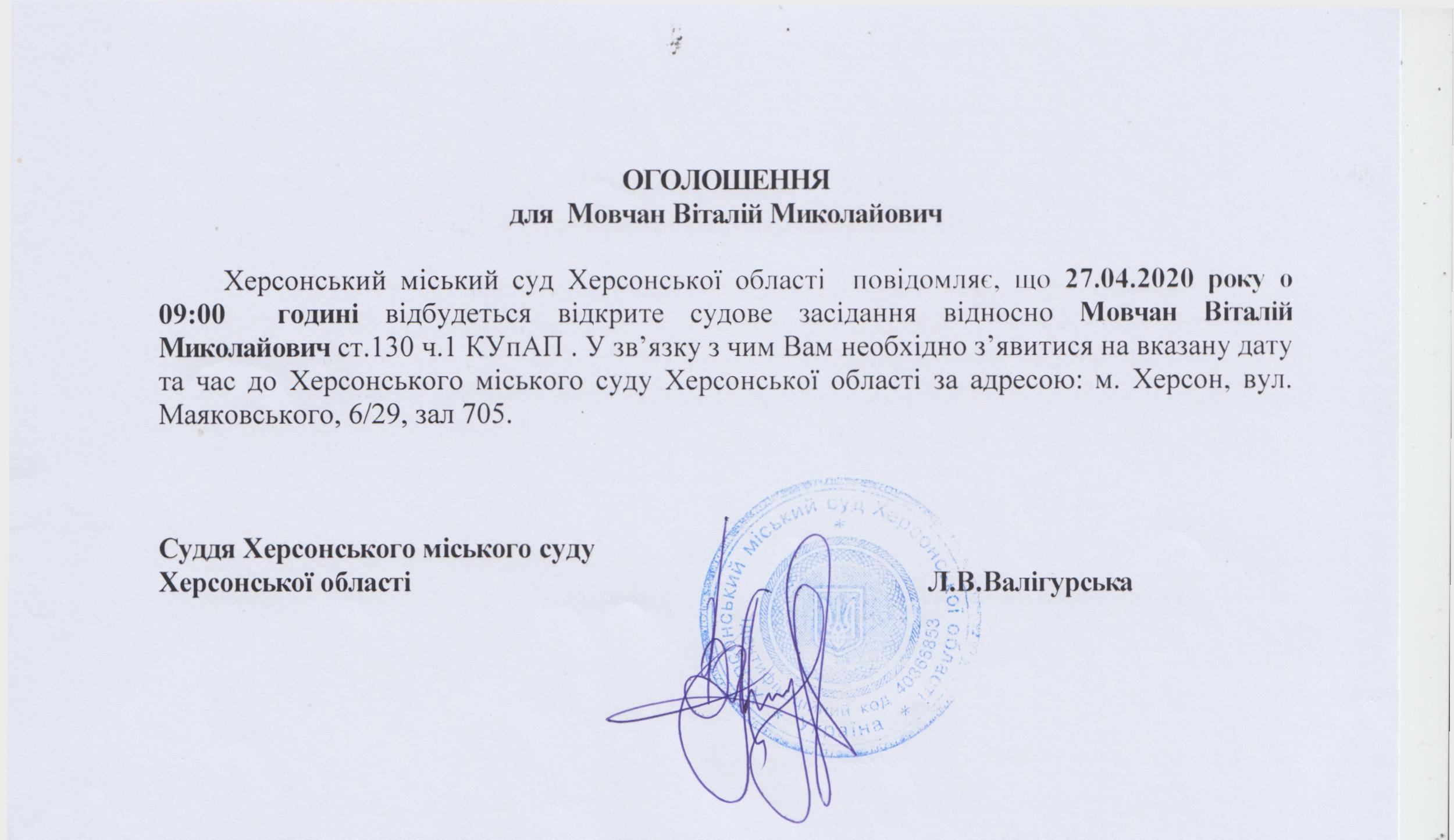 ОГОЛОШЕННЯ для Мовчан Віталія Миколайовича