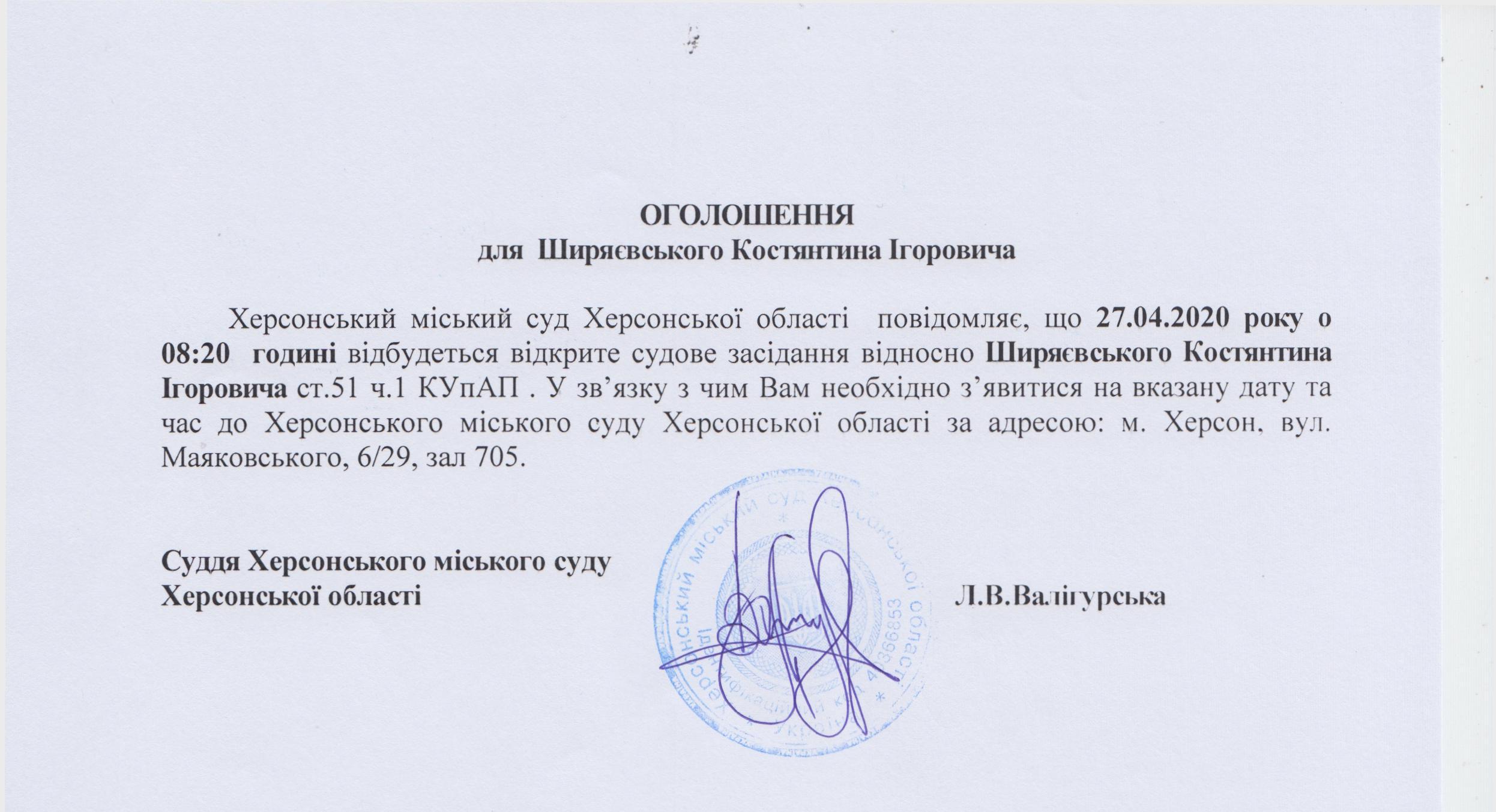 ОГОЛОШЕННЯ для Ширяєвського Костянтина Ігоровича