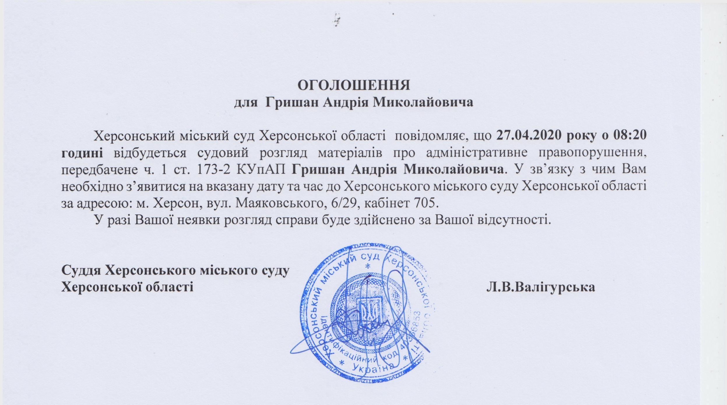 ОГОЛОШЕННЯ для Гришан Андрія Миколайовича
