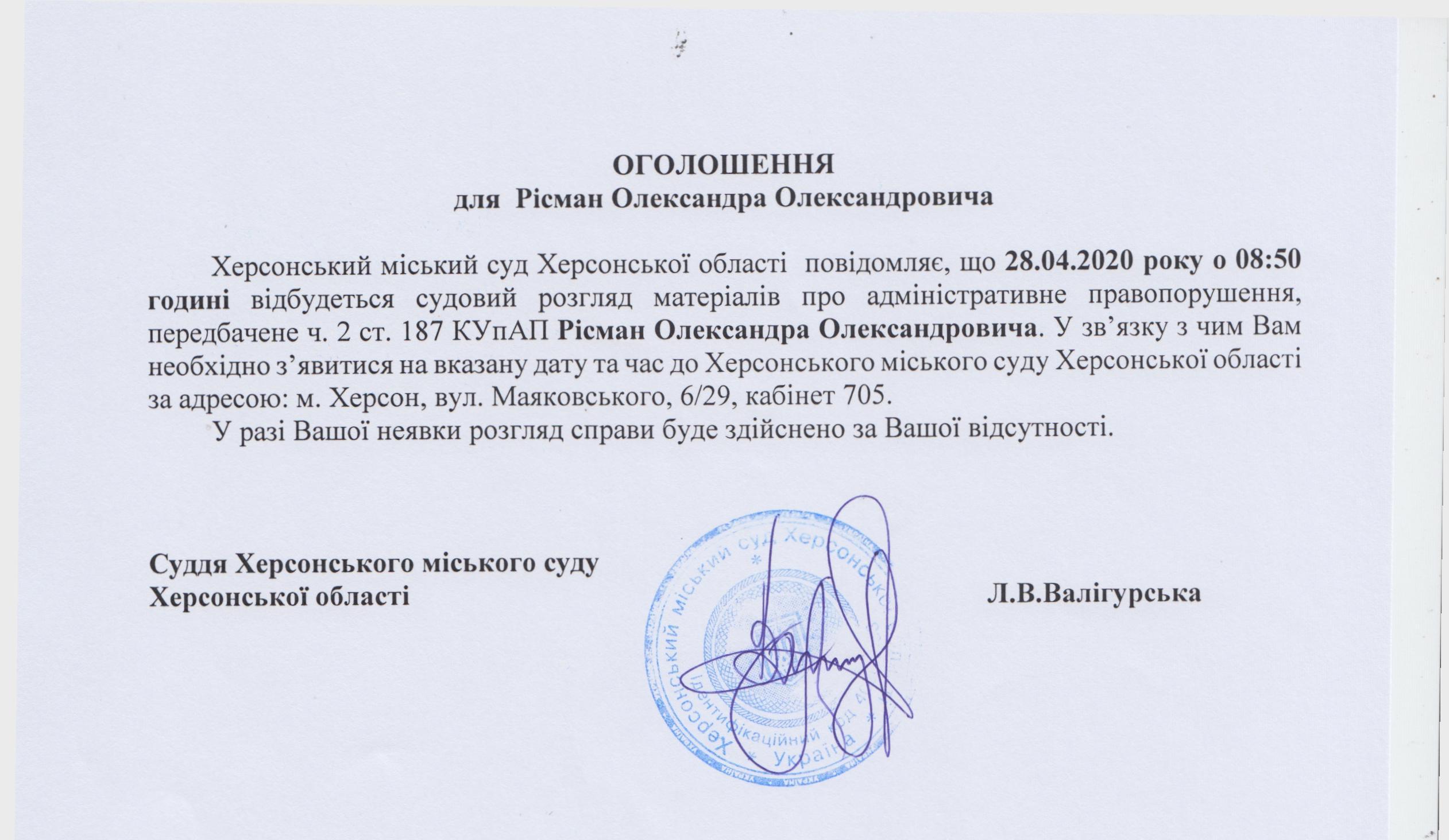 ОГОЛОШЕННЯ для Рісман Олександра Олександровича