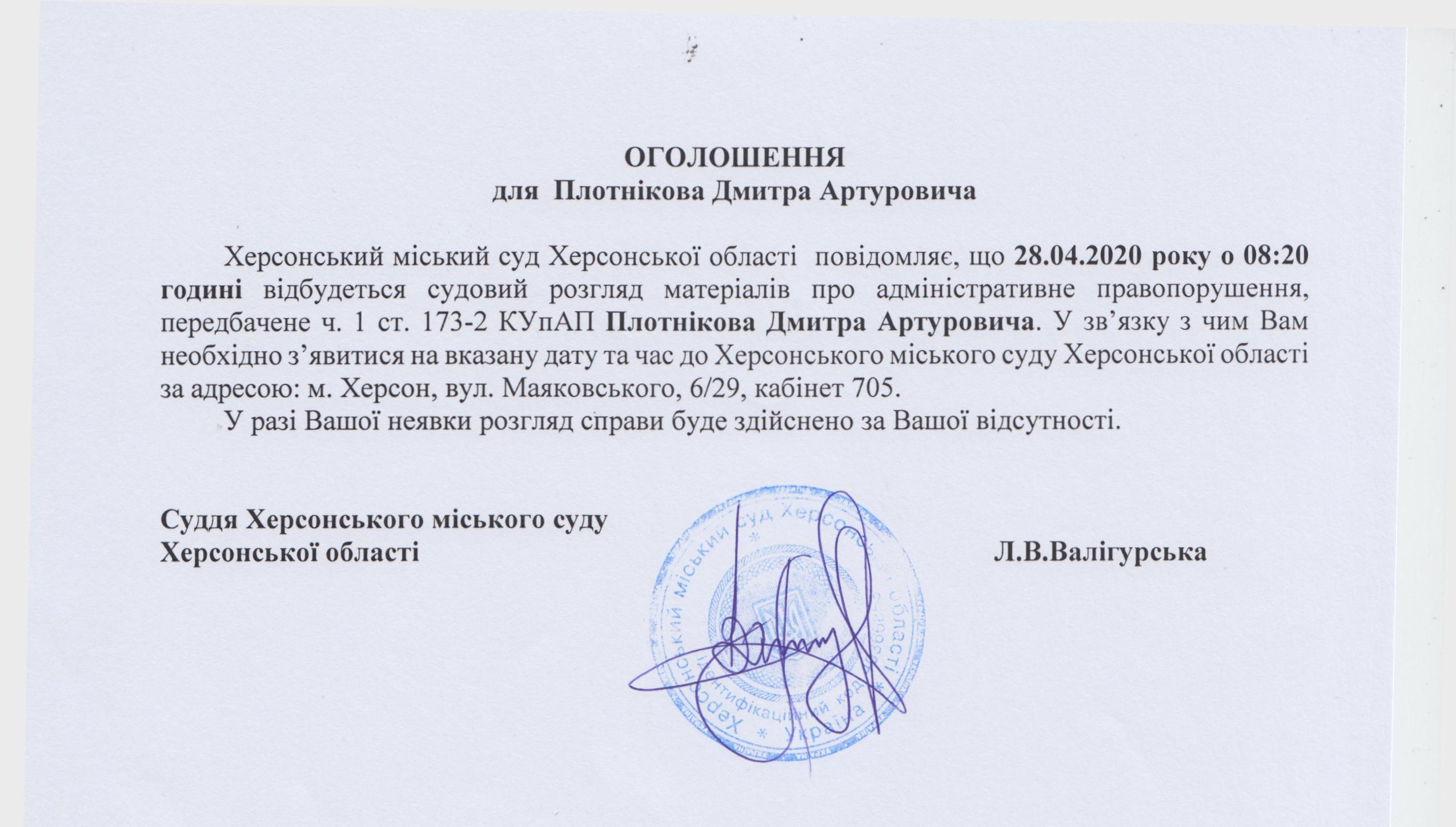 ОГОЛОШЕННЯ для Плотнікова Дмитра Артуровича