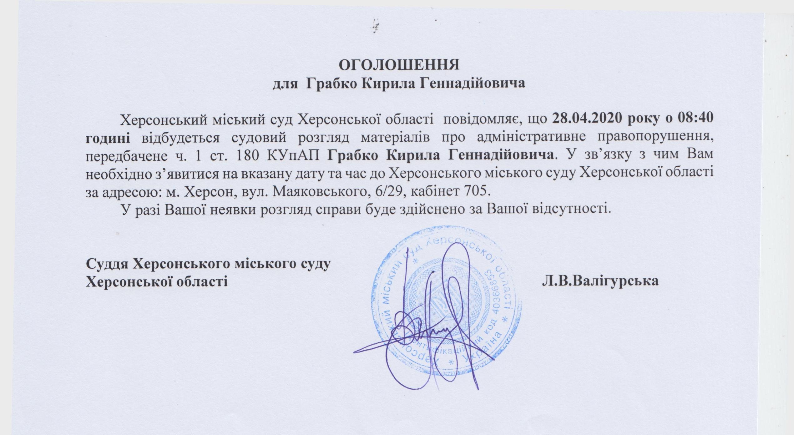 ОГОЛОШЕННЯ для Грабко Кирила Геннадійовича