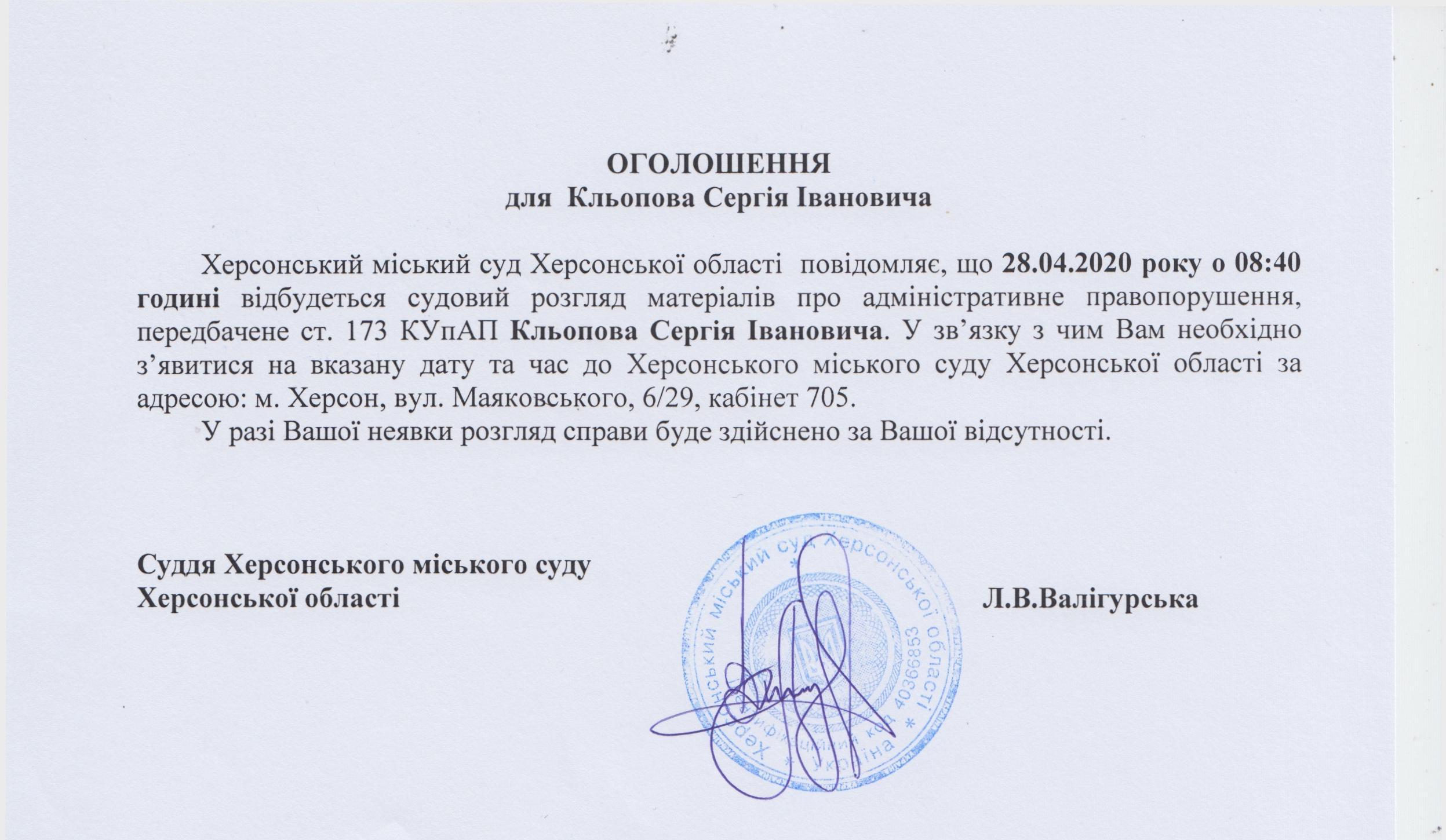 ОГОЛОШЕННЯ для Кльопова Сергія Івановича