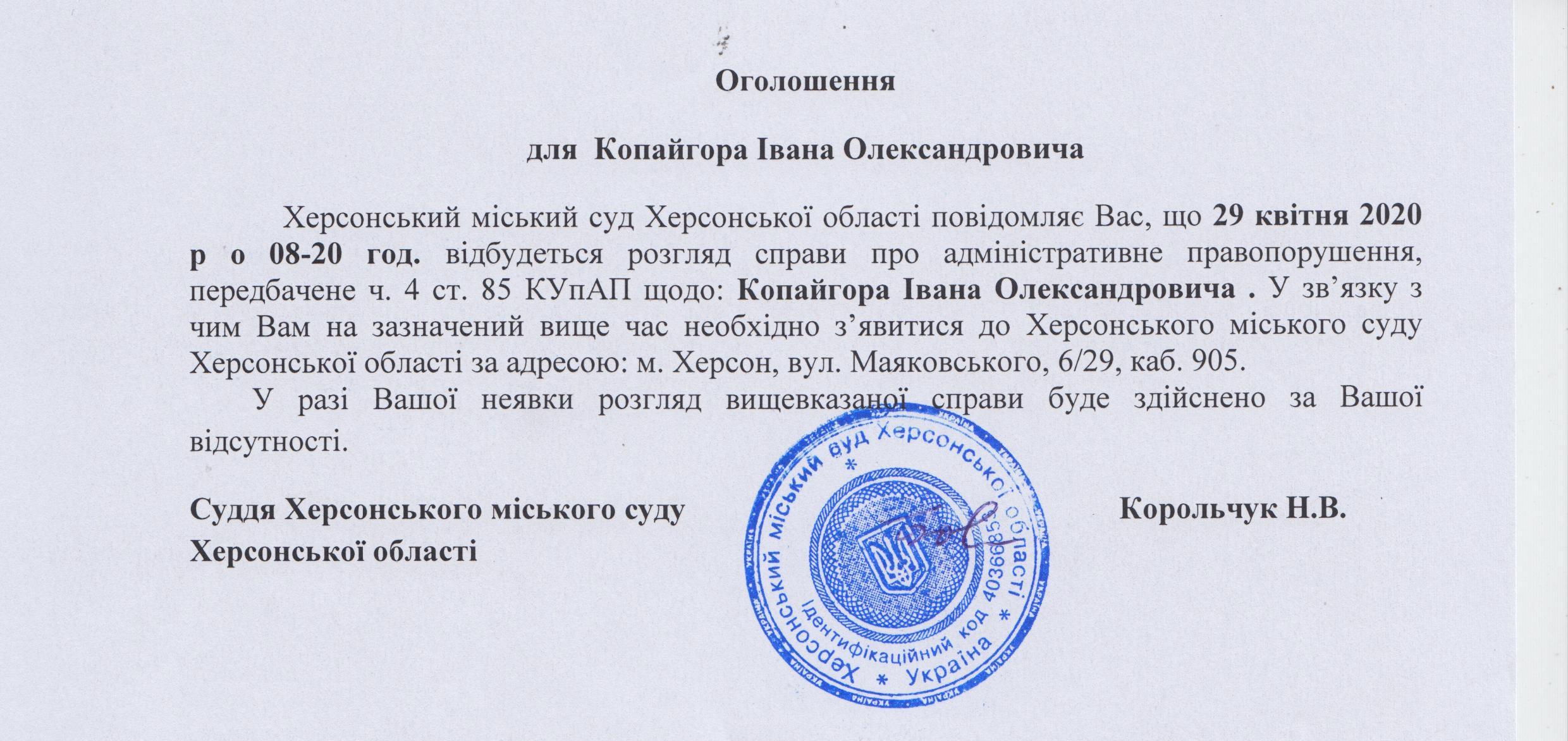 ОГОЛОШЕННЯ для Копайгори Івана Олександровича