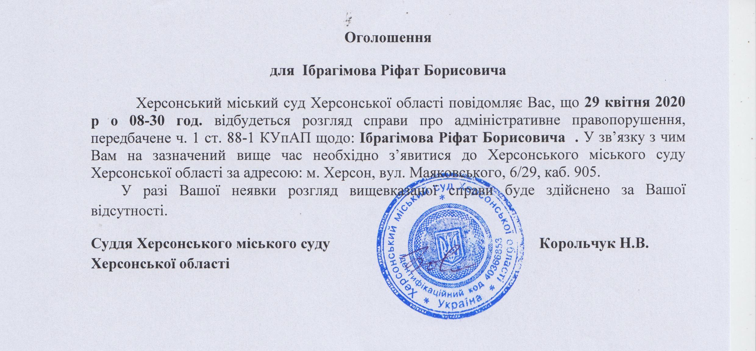 ОГОЛОШЕННЯ для Ібрагімова Ріфата Борисовича