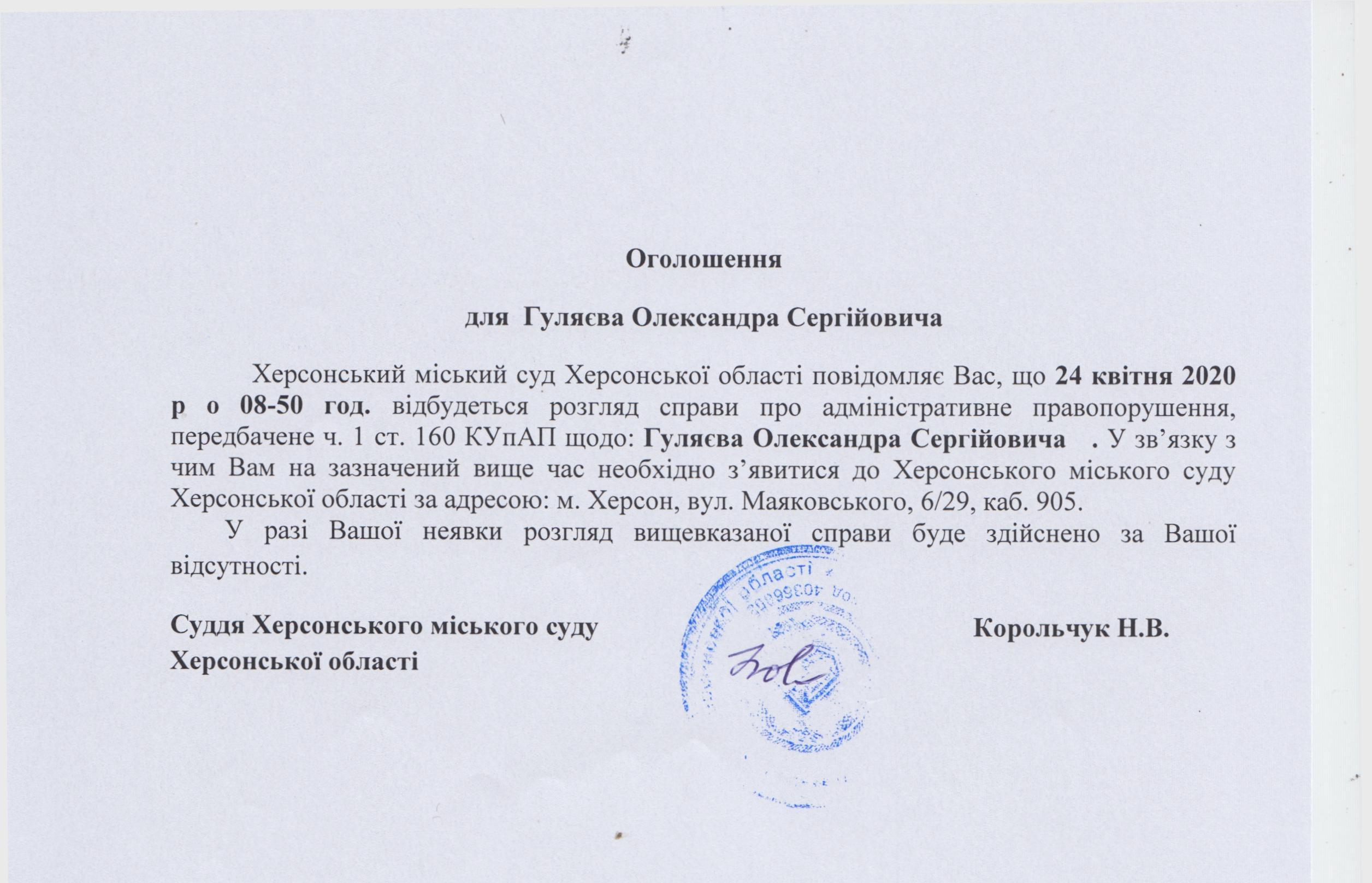 ОГОЛОШЕННЯ для Гуляєва Олександра Сергійовича