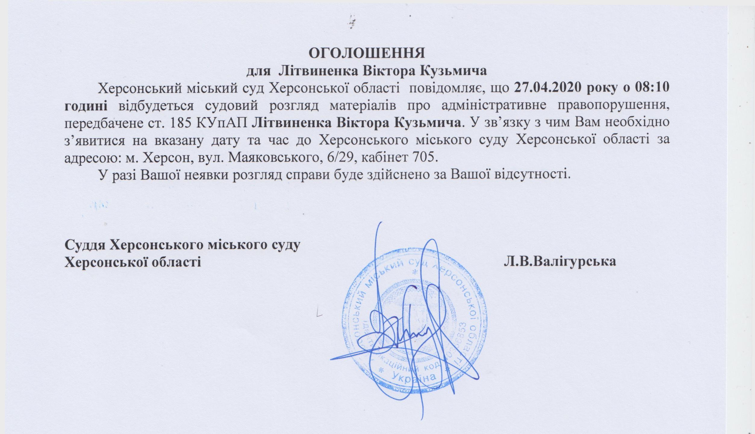 ОГОЛОШЕННЯ для Літвиненка Віктора Кузьмича