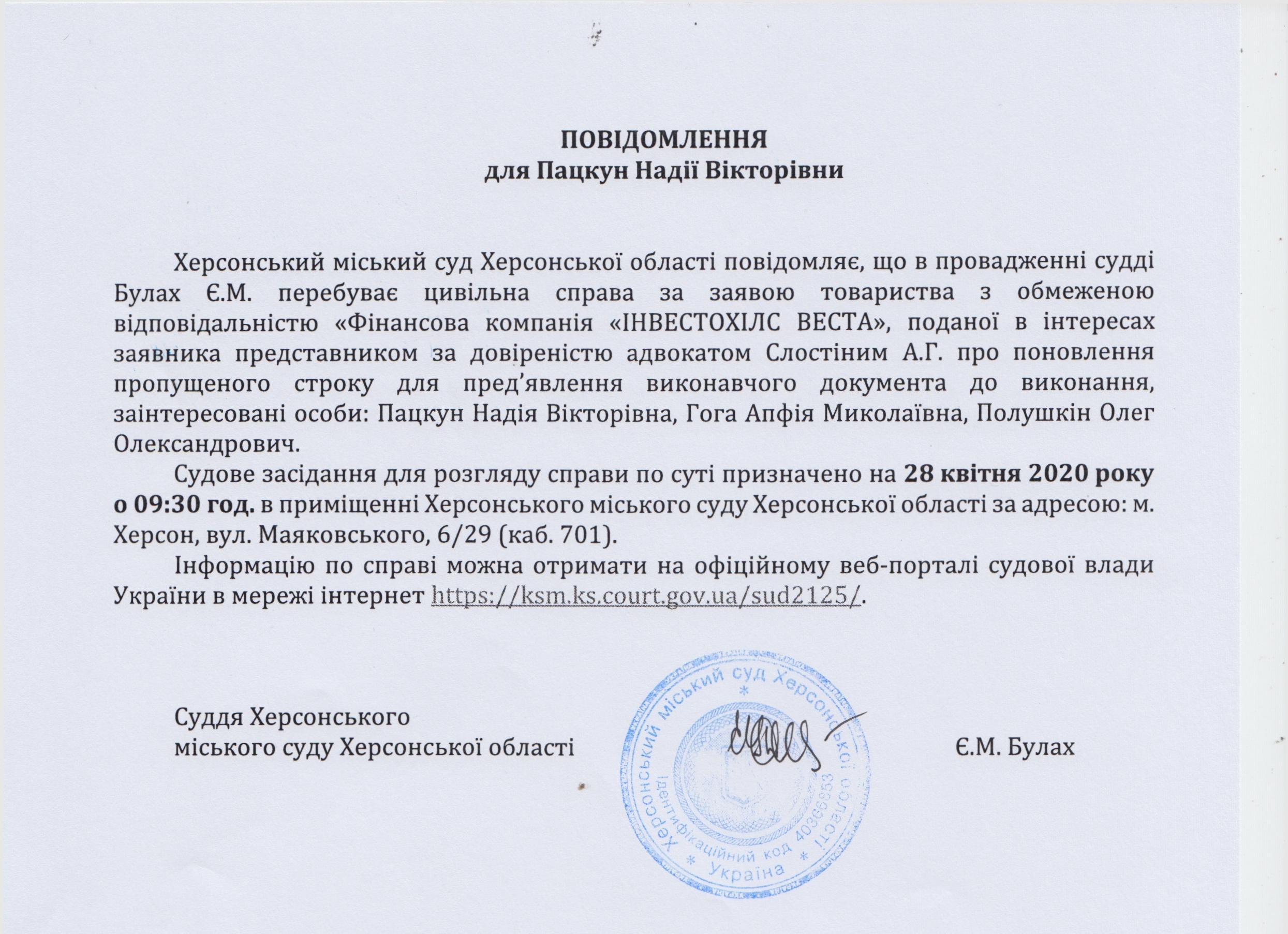 ОГОЛОШЕННЯ для Пацкун Надії Вікторівни