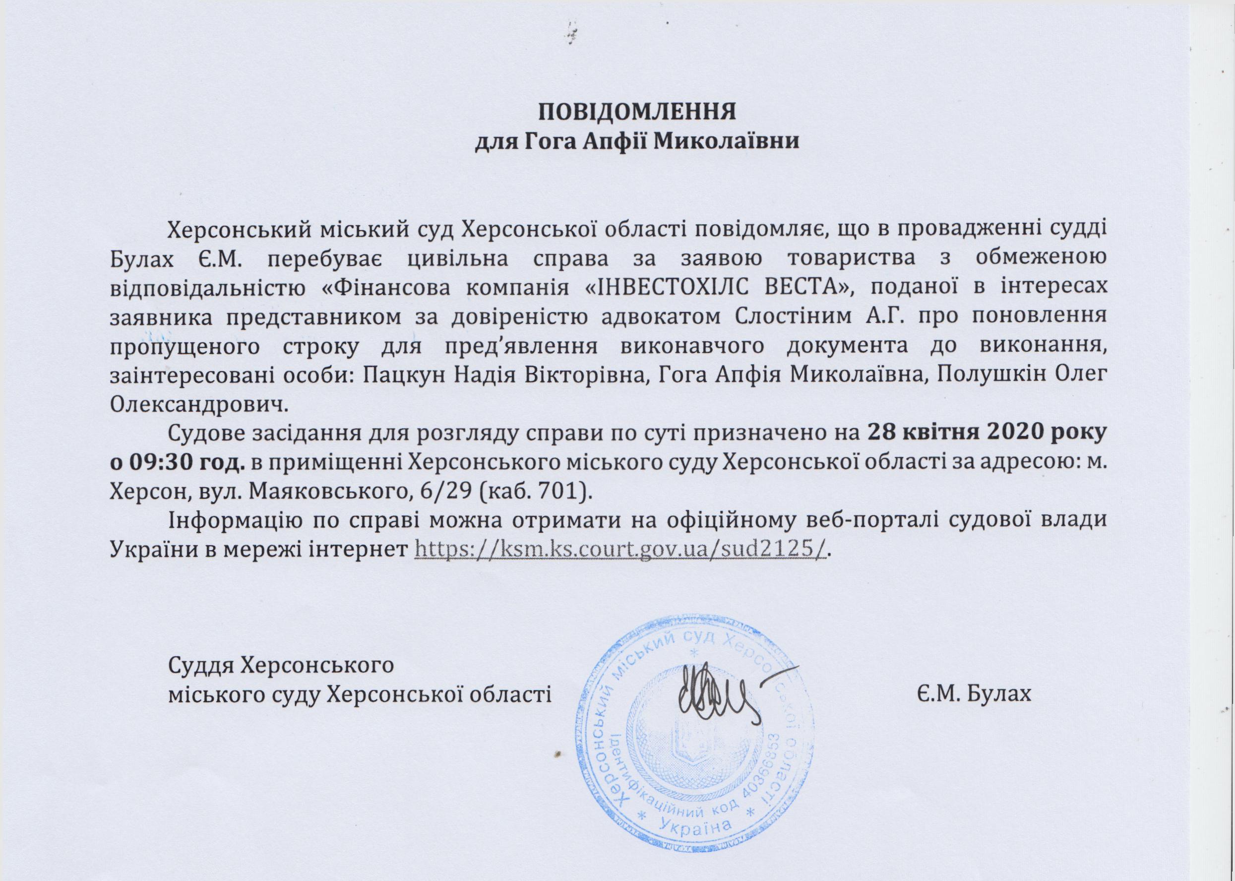 ОГОЛОШЕННЯ для Гоги Апфії Миколаївни