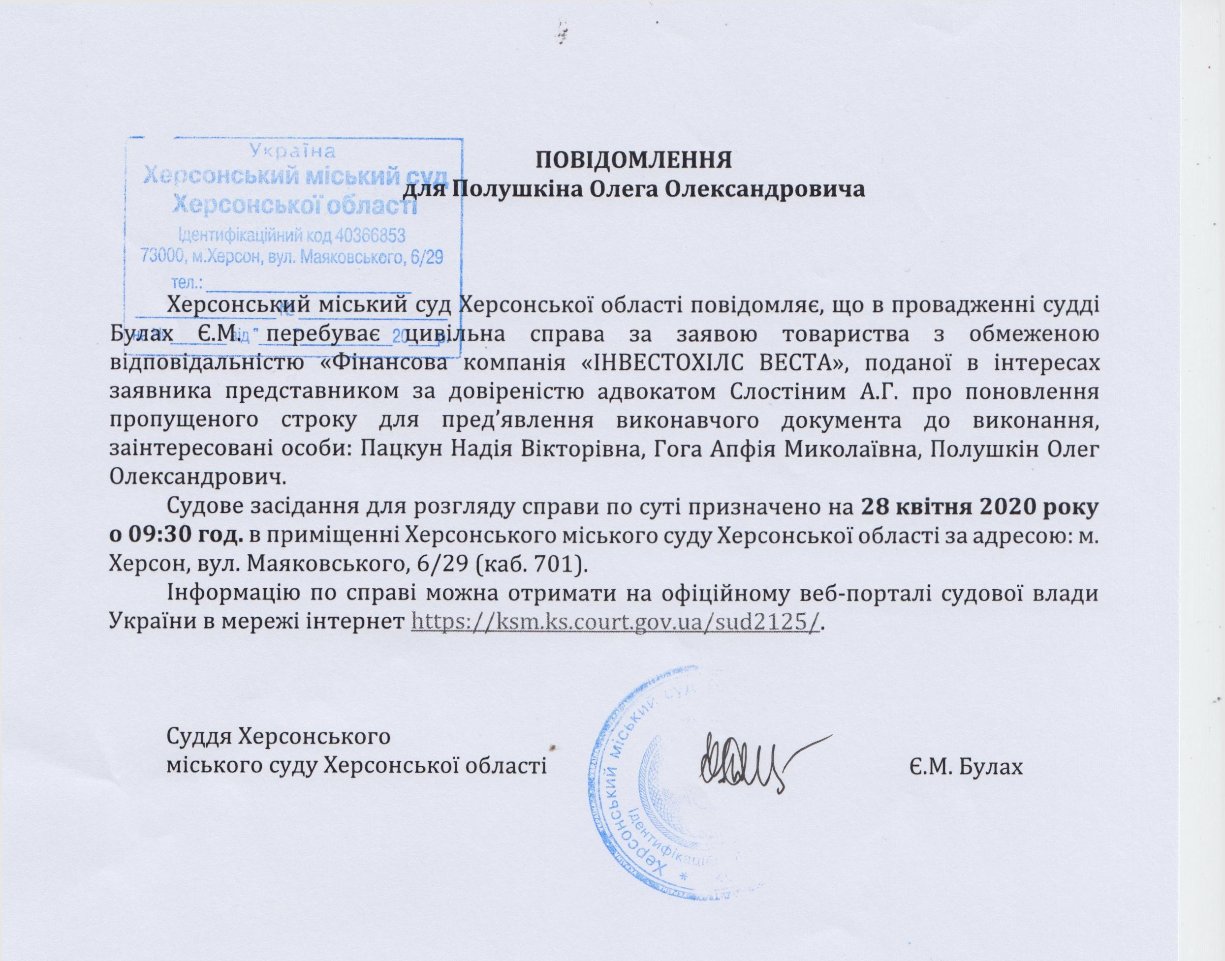 ОГОЛОШЕННЯ для Полушкіна Олега Олександровича