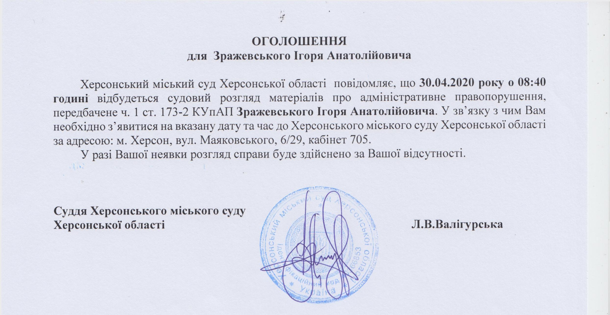 ОГОЛОШЕННЯ для Зражевського Ігоря Анатолійовича
