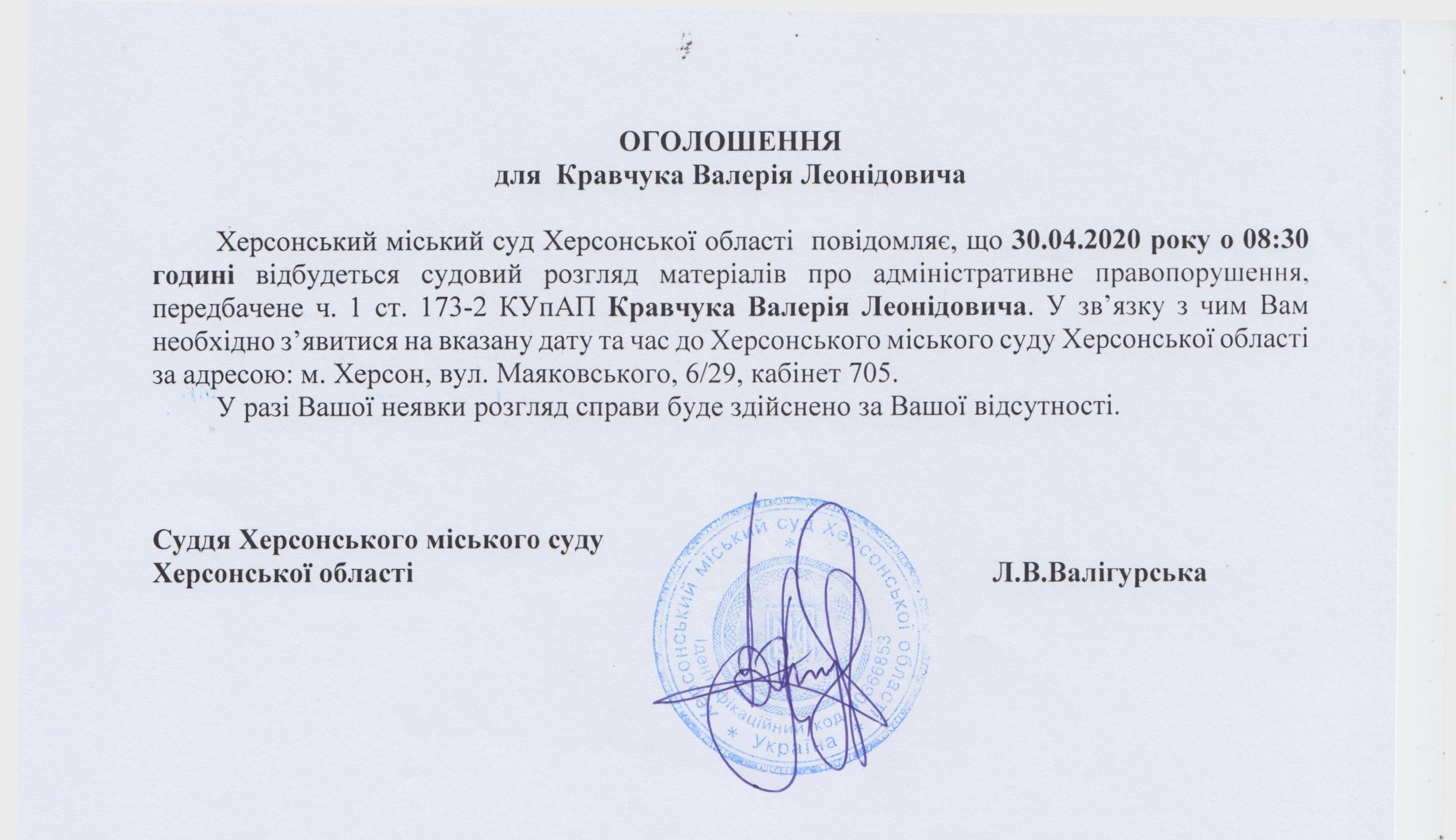 ОГОЛОШЕННЯ для Кравчука Валерія Леонідовича